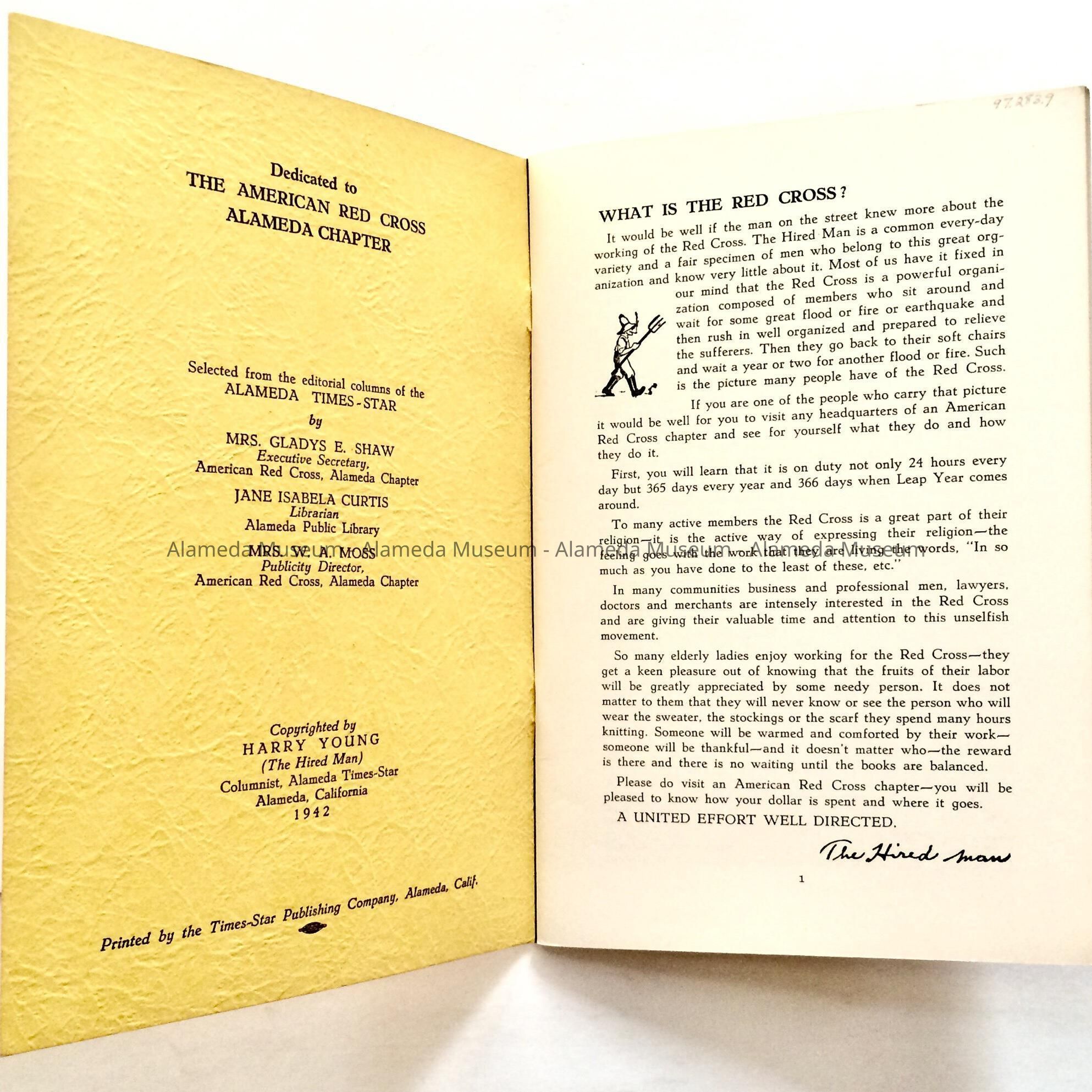 BOOKLET CONTAINING ARTICLES BY HARRY YOUNG, KNOWN AS "THE HIRED MAN," COLUMNIST FOR THE ALAMEDA TIMES-STAR, 1942. THE BOOKLET WAS PRINTED BY THE TIMES-STAR PUBLISHING COMPANY OF ALAMEDA.
