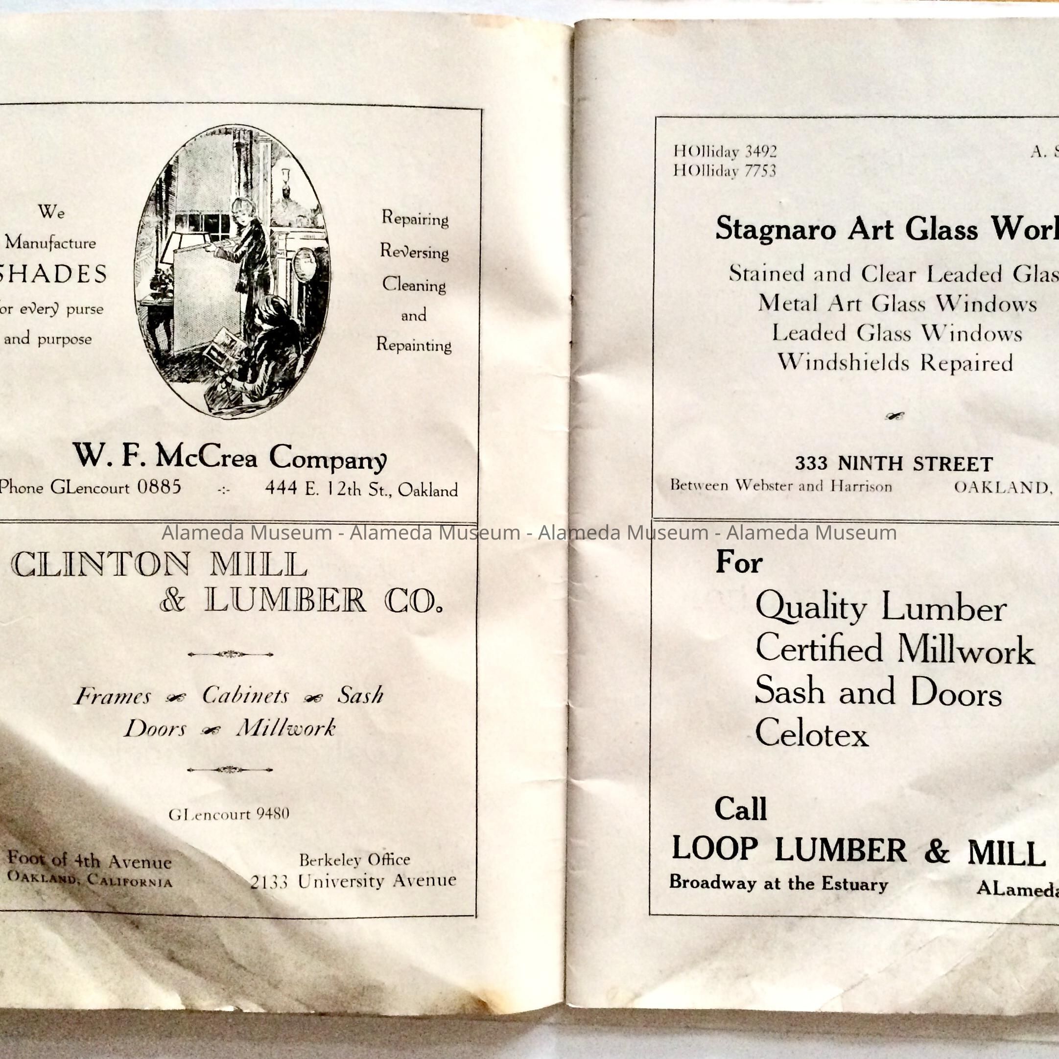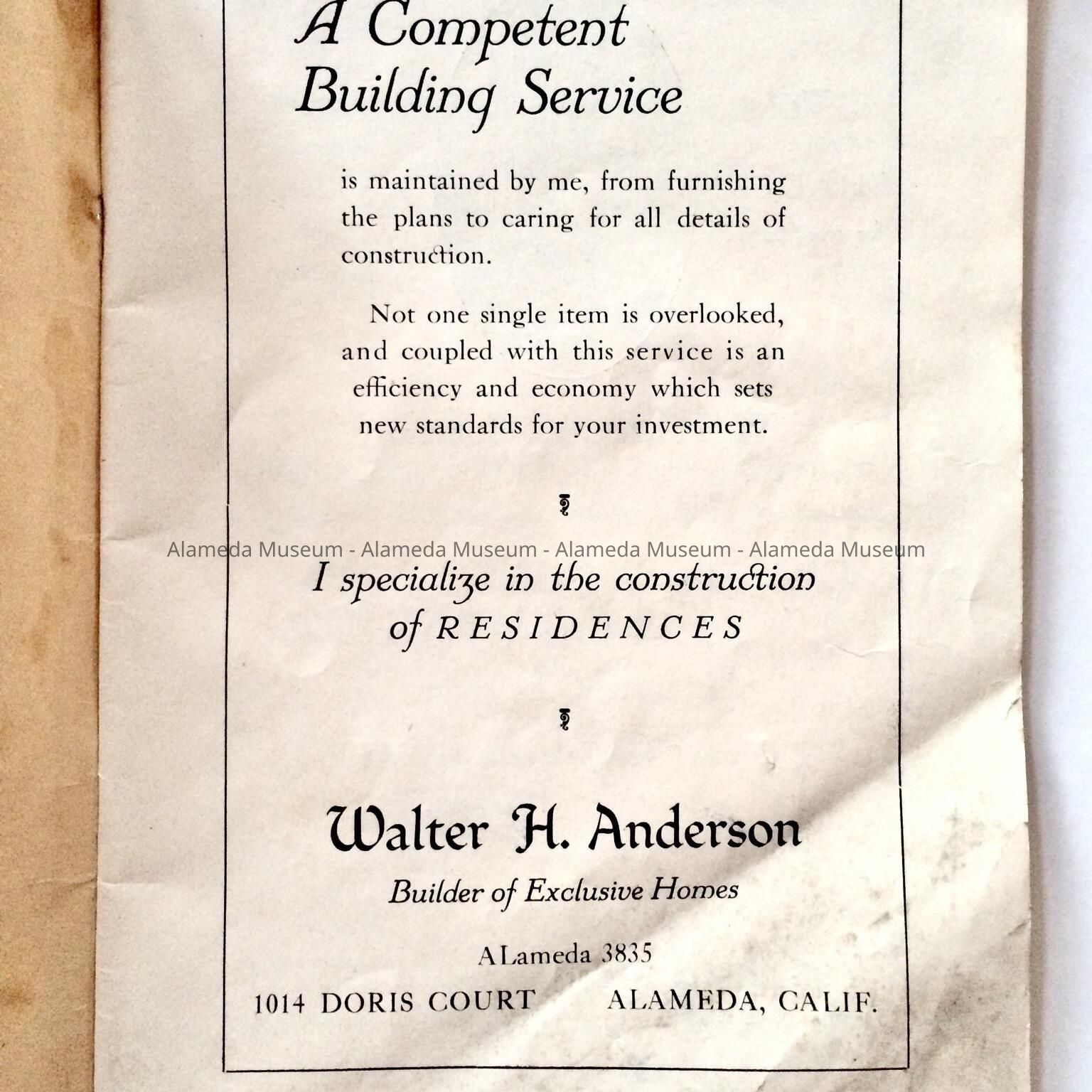 History of Object: An illustrated booklet produced by Walter H. Anderson of 1014 Doris Court, Alameda. The booklet is illustrated with drawings and copies of black and white structure photographs, as well as interior floor plans. It was partially funded by Alameda building contractors and suppliers and promotes the development of the Fernside residential development.