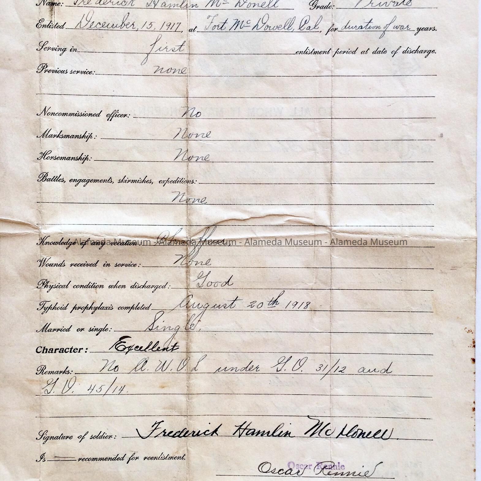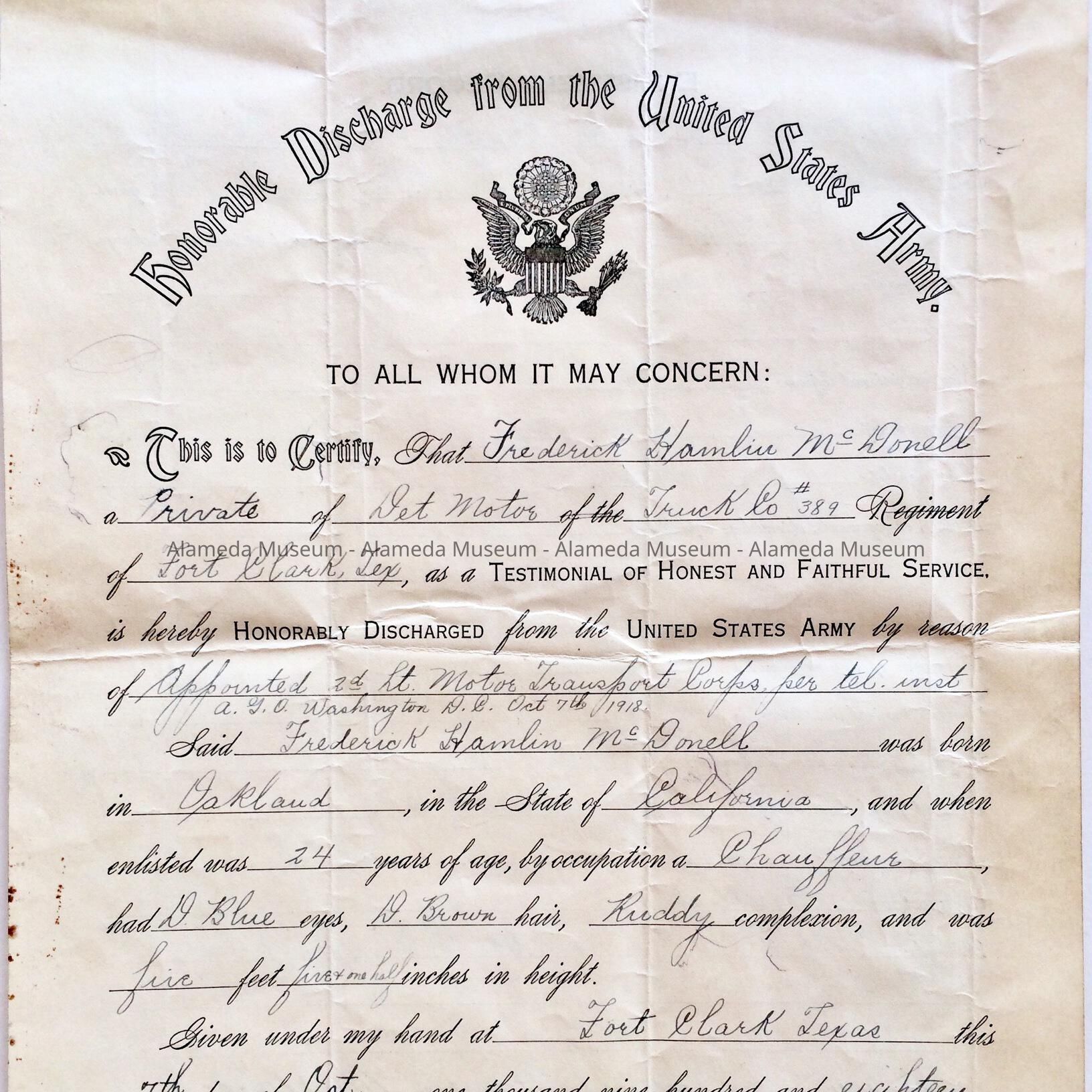 Honorable Discharge form of Frederick Hamlin McDonell, October 1918Entry/Object ID