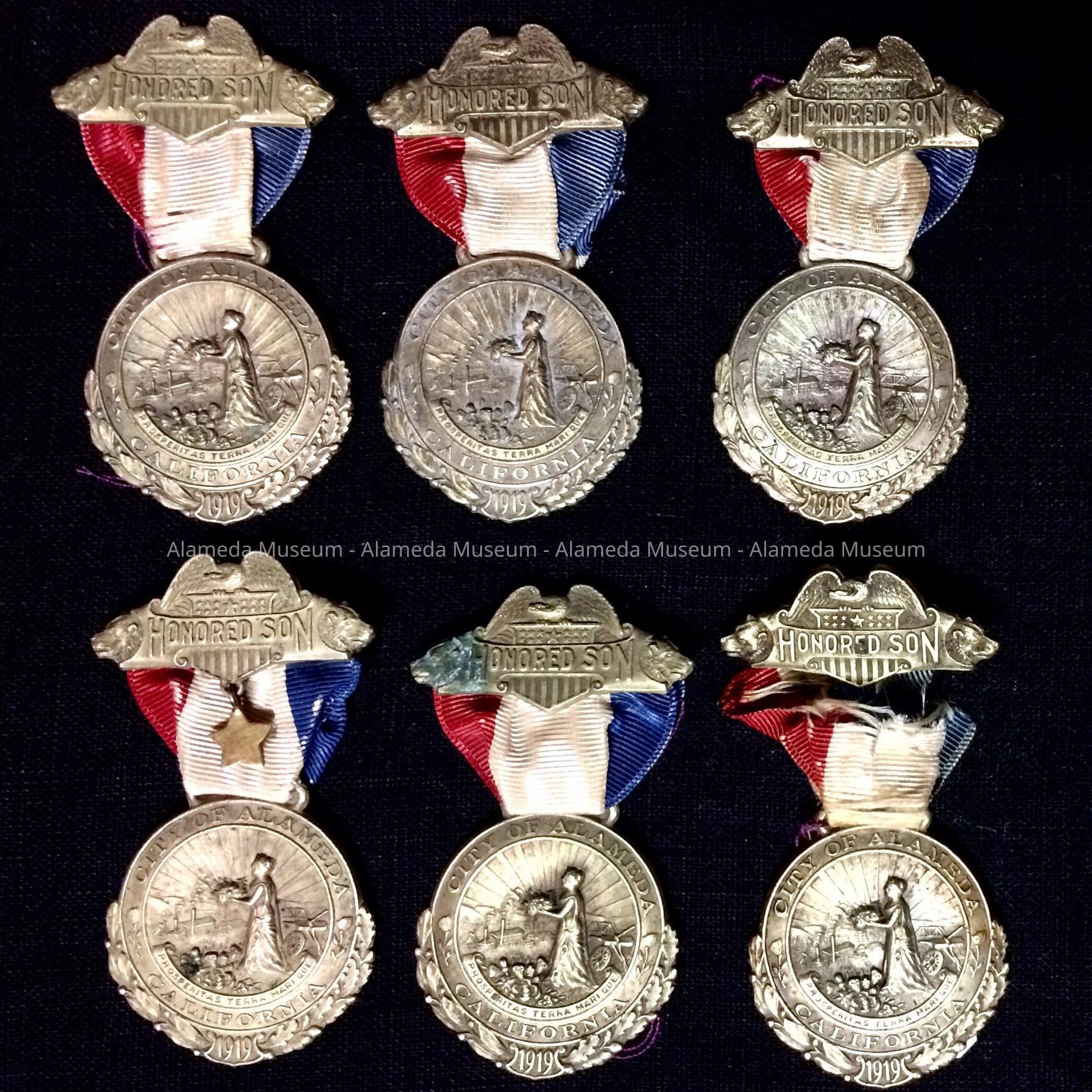 Description: Medals in the form of a medallion suspended from a red, white and blue colored silk ribbon attached to a bar pin. The motif on the bar pin is in embossed lettering reading, "Honored Son" and includes decorative designs of an outstretched eagle's wings above the heads of two California state bears. The emblem has the inscription, "City of Alameda, California, 1919" and the city logo of a standing woman in a field of industrial symbols. Each medal is engraved with the names Irvine & Jackens, 1027 Market St., San Francisco.