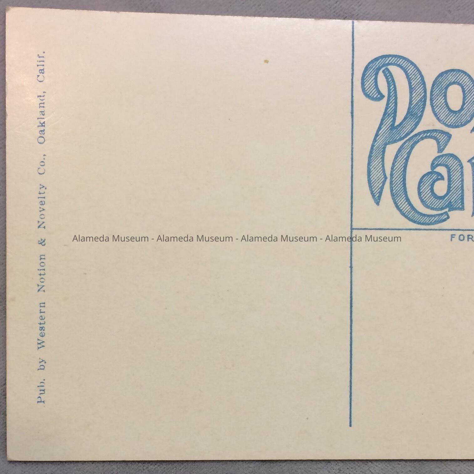 Description: Colored photographic post card, published by the Western Notion & Novelty Co., Oakland, Calif. Size, 5½x3½ inches.