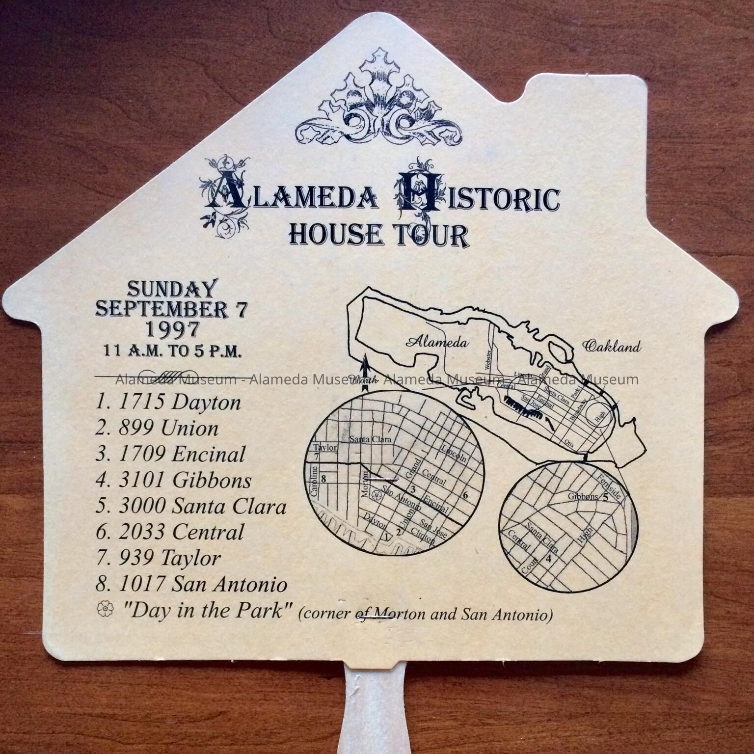 HISTORY OF OBJECT: A FAN GIVING A MAP AND LOCATION OF VARIOUS HOUSES INCLUDED ON THE ALAMEDA HERITAGE HOME TOUR FOR SEPTEMBER 7, 1997. IT WAS HELD UNDER THE AUSPICES OF THE PRESERVATION SOCIETY AND THE ALAMEDA MUSEUM.