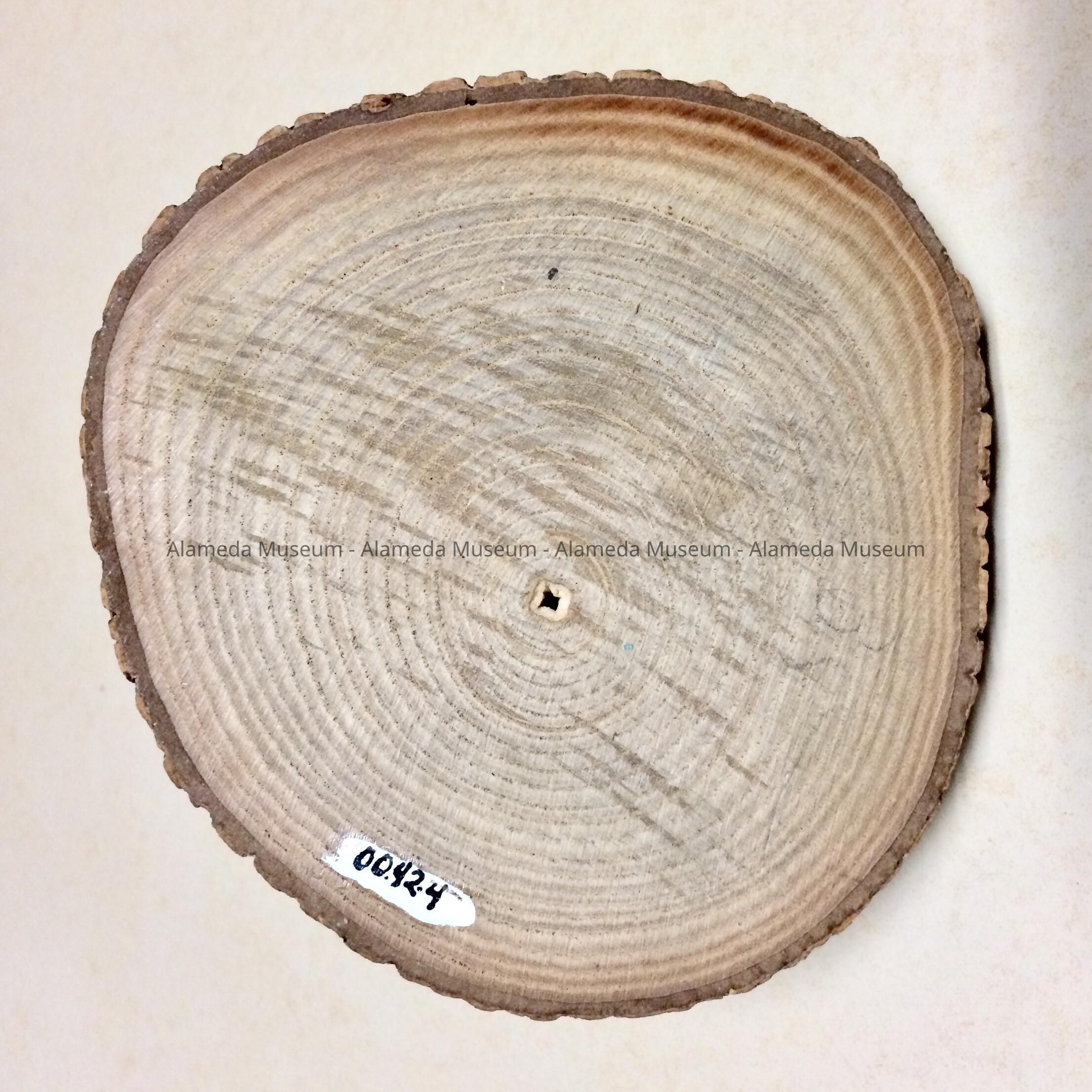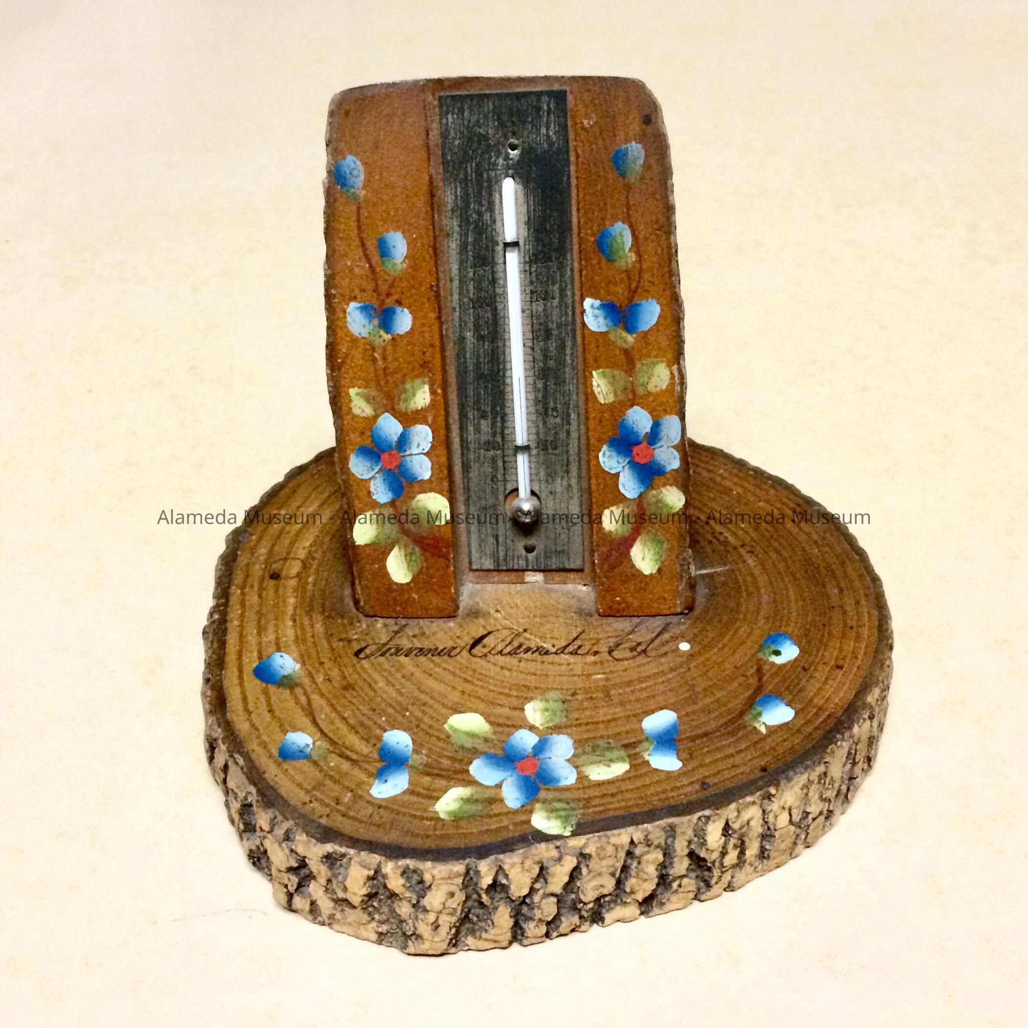 Description: Glass barometer mounted on metal backplate which serves as a temperature gauge. This in turn is mounted in a pseudo wooden frame attached to a circular wooden base. As a decoration, the base has exterior bark. Object hand painted with flowers and leaves in red, blue and green.