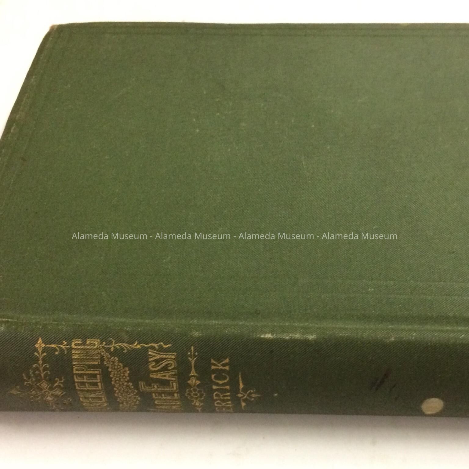 Hard bound book with green colored buckram covered cover, incised gold lettering on spine stating title "Housekeeping Made Easy," "Herrick," & "Harpers."