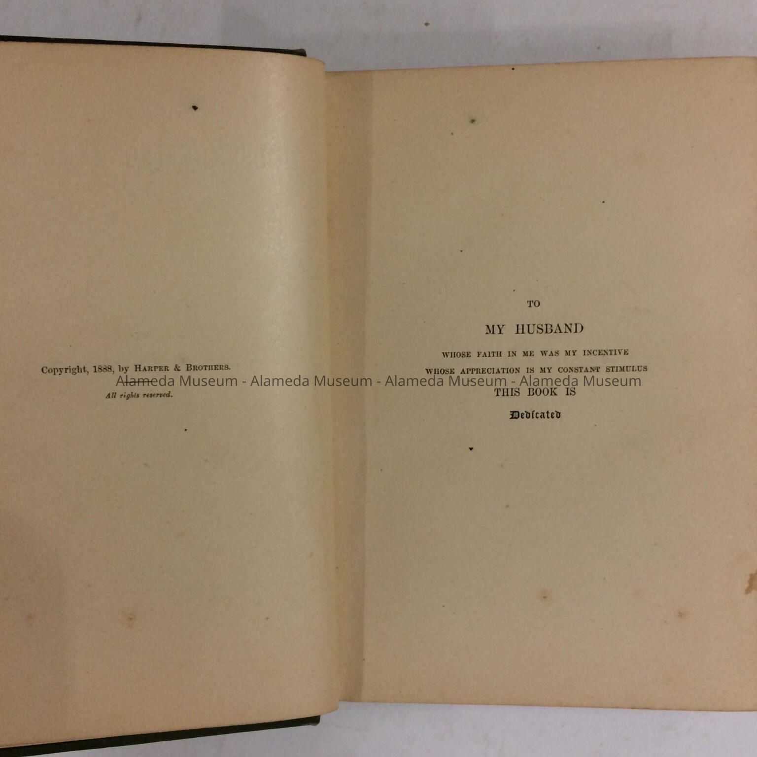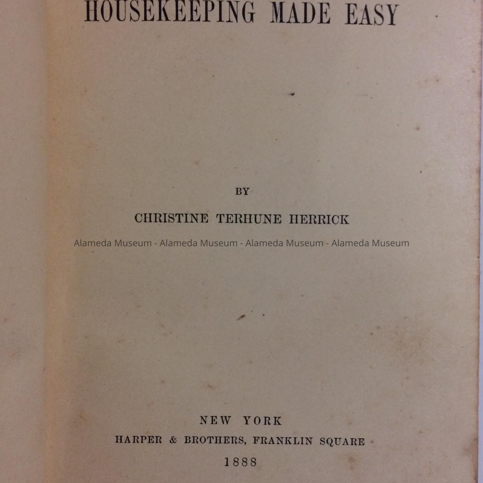 Book entitled "Housekeeping Made Easy," by Christine Terhune Herrick, Harper & Brothers publisher, New York, 1888. Interesting book of housekeeping hints during the late Victorian period. Such topics include engaging a maid, cleaning specific rooms in the house, laundry, etc. An invaluable glimpse into Victorian domestic practices.