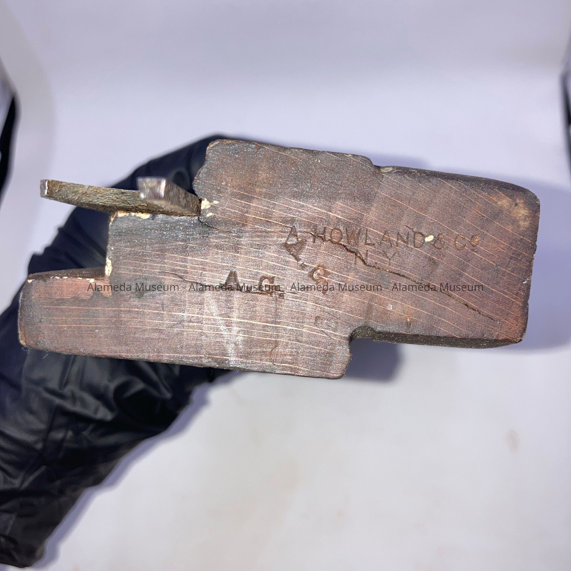 History of Object: Howland & Co. 11" Hand plane, part of a collection of carpentry tools, owned by John Ucovich (presumed), an immigrant carpenter from Montenegro. John Ucovich moved to Alameda around 1925, and ran a trucking business in Oakland. By 1938 John (aged 61) lived with his wife, Myrtle May, at 775 Santa Clara. He died as the result of injuries sustained after being run over by a streetcar on March 28, 1938.