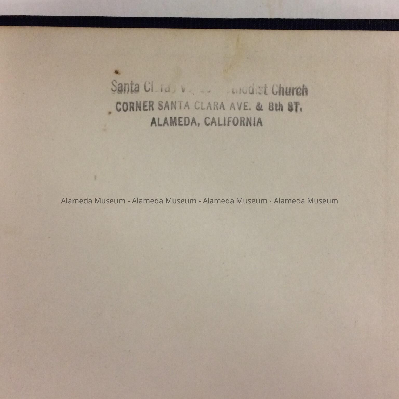 History of Object: Hymnal from the Santa Clara Avenue Methodist Church, corner Santa Clara Ave. & 8th Street, Alameda, which was destroyed by fire.
