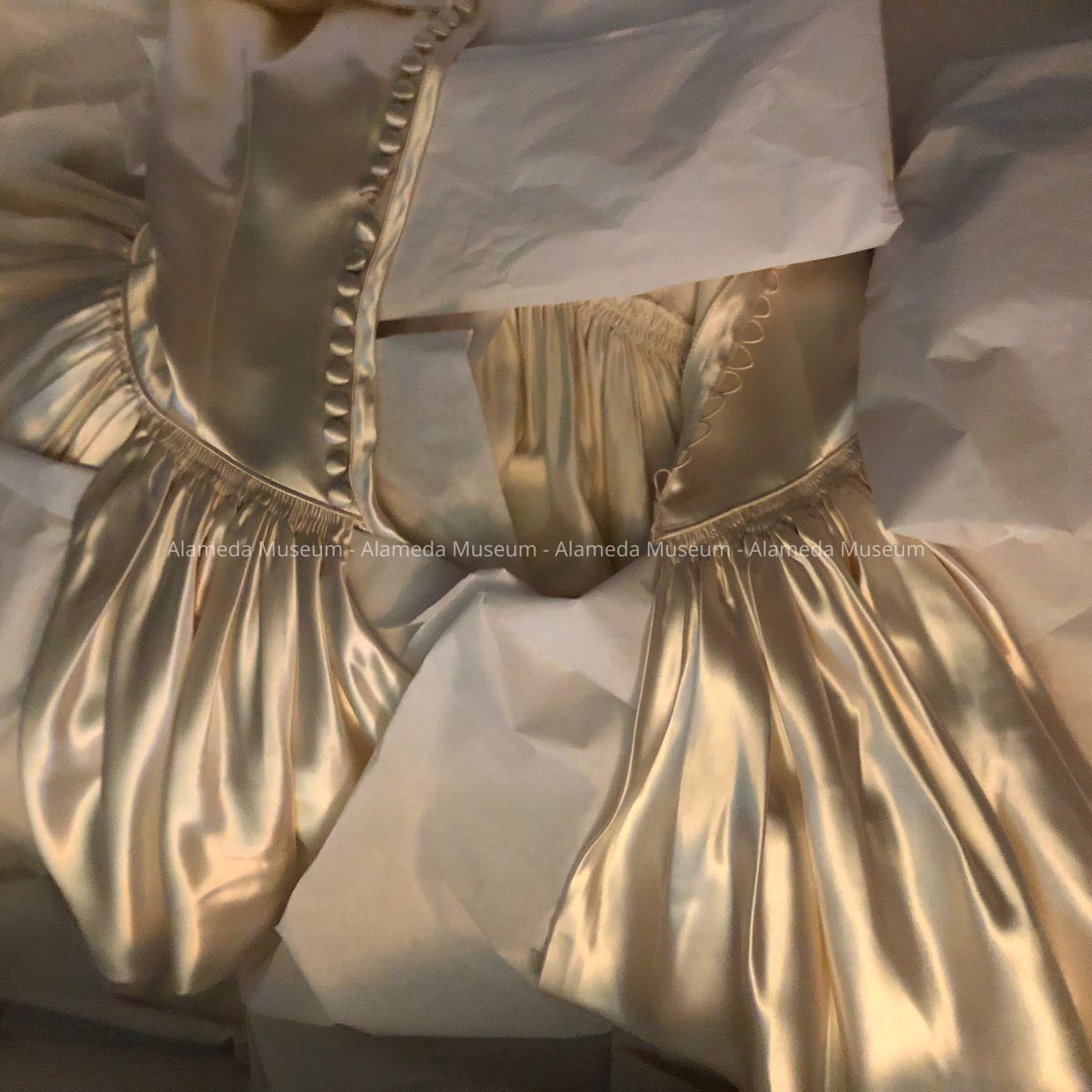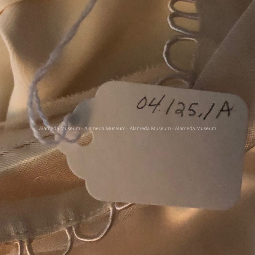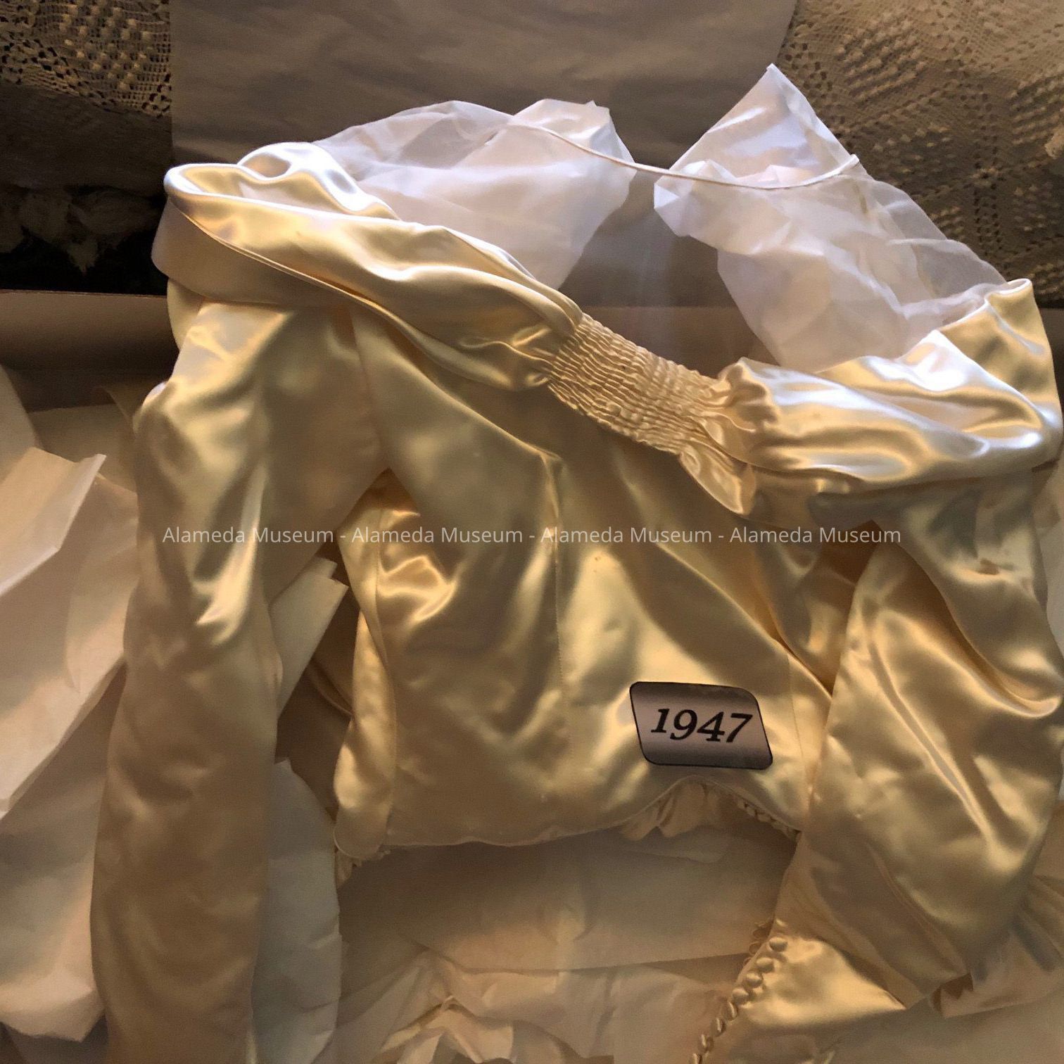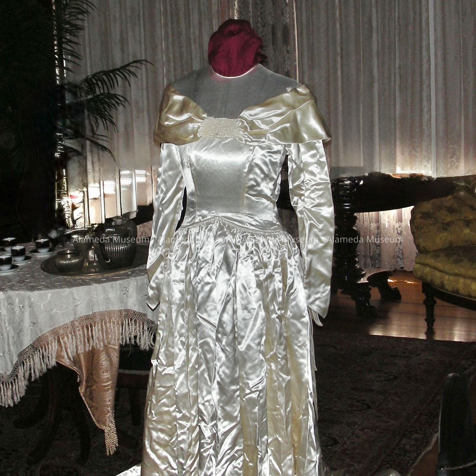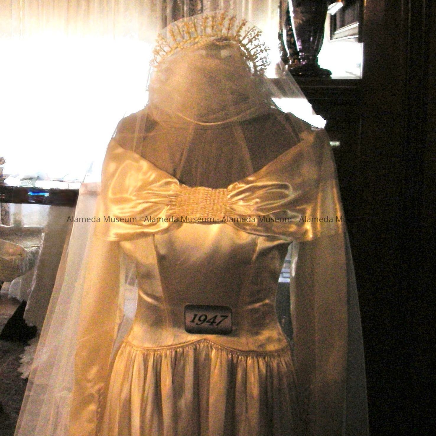 HISTORY OF OBJECTS: WEDDING GOWN OF LOIS JEAN SMITH HOFFMAN, REAL ESTATE BROKER. WEDDING WAS PERFORMED ON SEPTEMBER 11, 1947 IN CHRIST EPISCOPAL CHURCH (WHICH BURNED DOWN IN 1960). LOIS' FATHER WAS CHARLES SMITH, PLUMBER, AND GRANDDAUGHTER OF CHARLES AND LILLIAN SMITH WHO CAME TO ALAMEDA IN 1907 WHERE THE PLUMBING BUSINESS WAS ESTABLISHED IN 1927 ON 1250 PARK STREET.