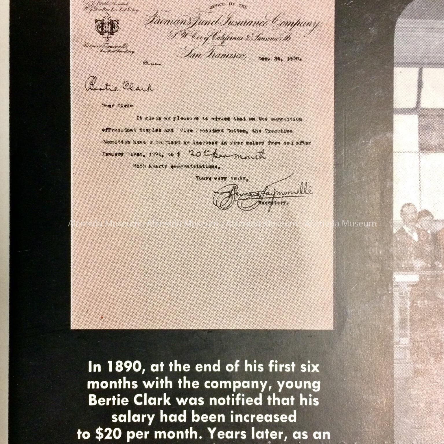 History of Object: Publication issued by the Fireman’s Fund Insurance Company, 3333 California Street, San Francisco. Has a facsimile of a letter of 1890 stating that young Bertie Clark, an employee for six months, just received a raise. Years later he became one of the company's most loyal boosters.