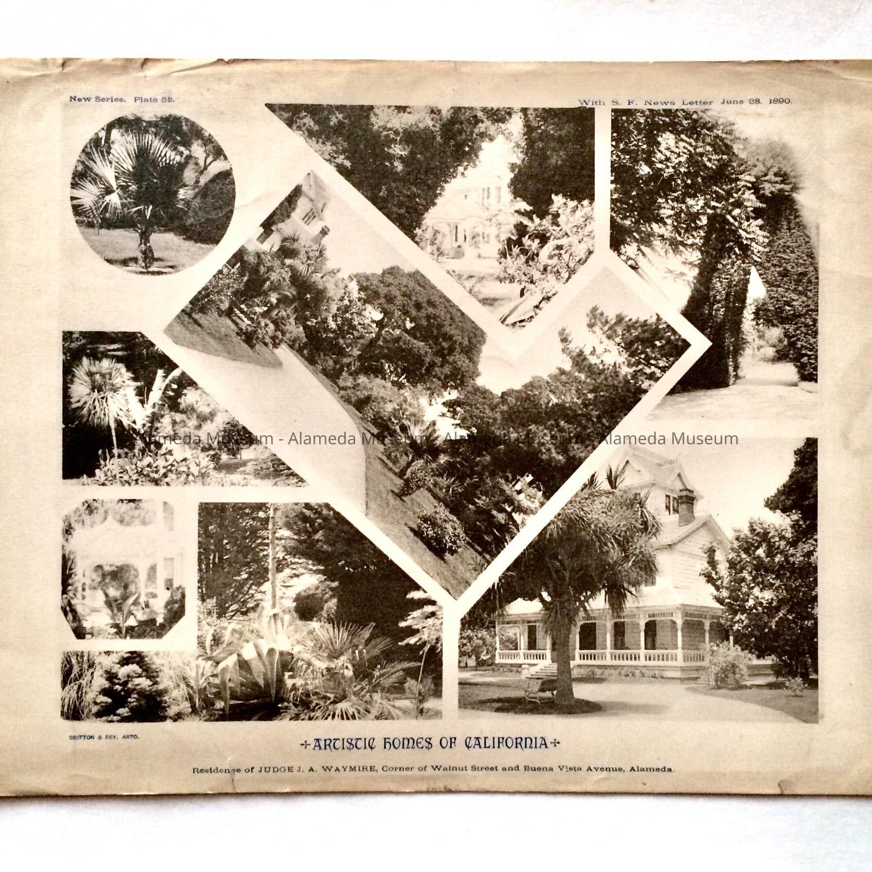 History of Object: An illustrated printed photograph plate by Britton & Rey as part of a San Francisco News supplement, dated June 28,1890. It depicts the residence of J. A. Waymire that was located at the corner of Walnut St. and Buena Vista Ave., Alameda (now the site of McKinley Park).