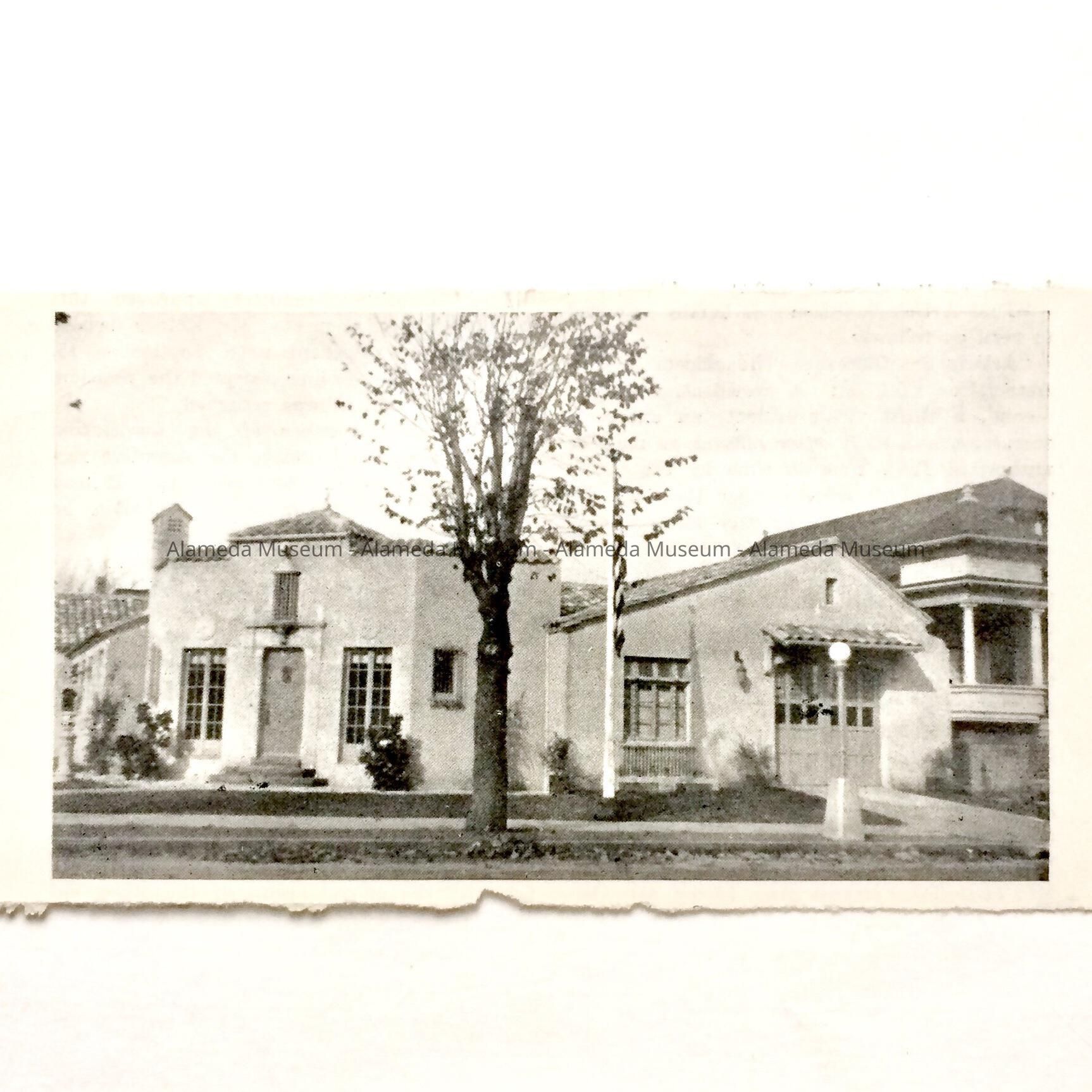 AN ILLUSTRATION DEPICTING THE MAIN FACADE OF THE ALAMEDA FIRE DEPARTMENT BUILDING ON GRAND STREET AND PACIFIC AVENUE (NORTHWEST CORNER).