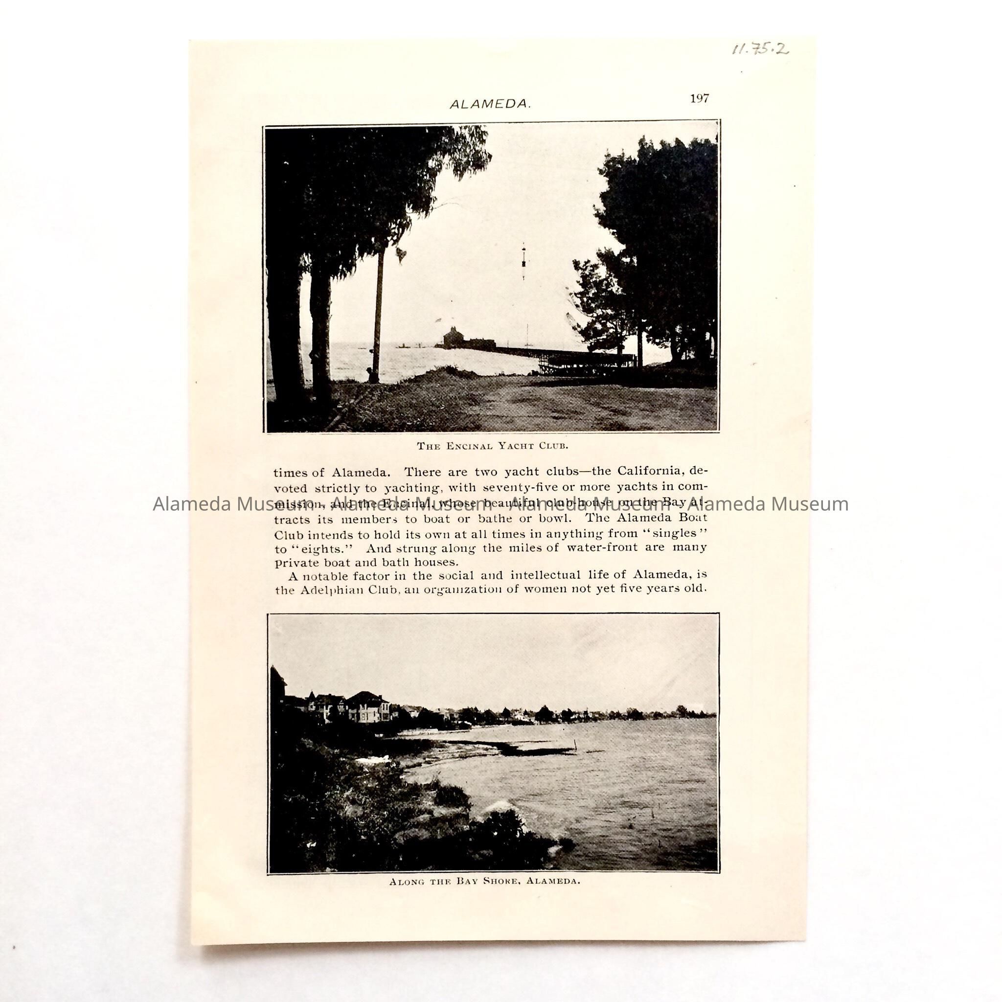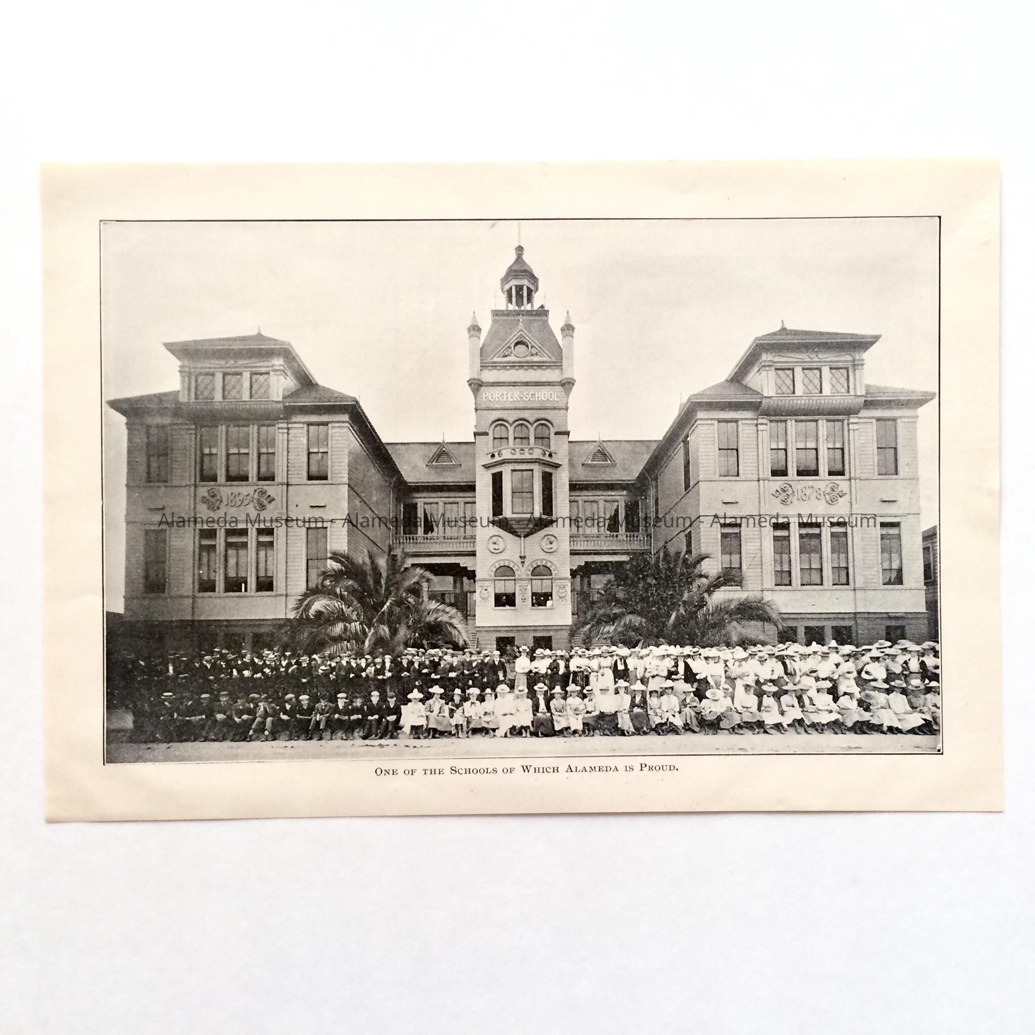 DESCRIPTION: AN IMAGE REMOVED FROM A BOOKLET. IT IS AN ILLUSTRATION FEATURING A CAPTION, "ONE OF THE SCHOOLS OF WHICH ALAMEDA IS PROUD."