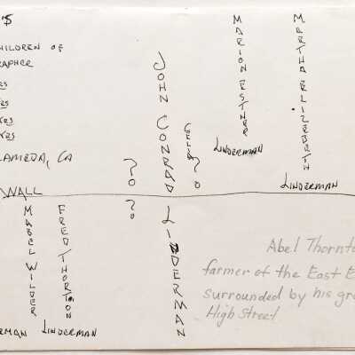 HISTORY OF OBJECT: PHOTOLITHOGRAPHIC ILLUSTRATION, SHOWING PIONEER FARMER ABEL THORNTON, READING "SUNSET" MAGAZINE, SURROUNDED BY HIS GRANDCHILDREN --- MARTHA, MARION, FRED, AND MABEL LINDERMAN. PHOTO WAS TAKEN IN FRONT OF THE THORNTON HOME, HIGH STREET, WEST SIDE, NEAR LINCOLN PARK, ALAMEDA.