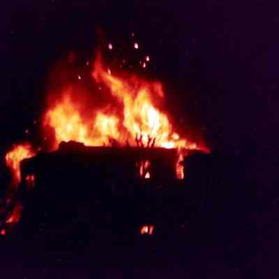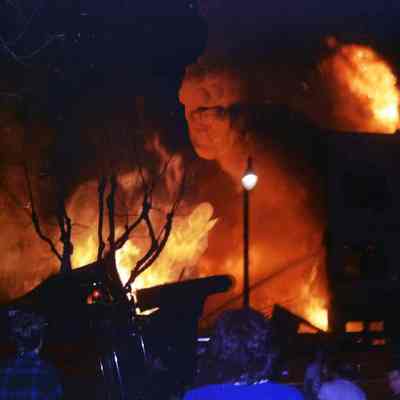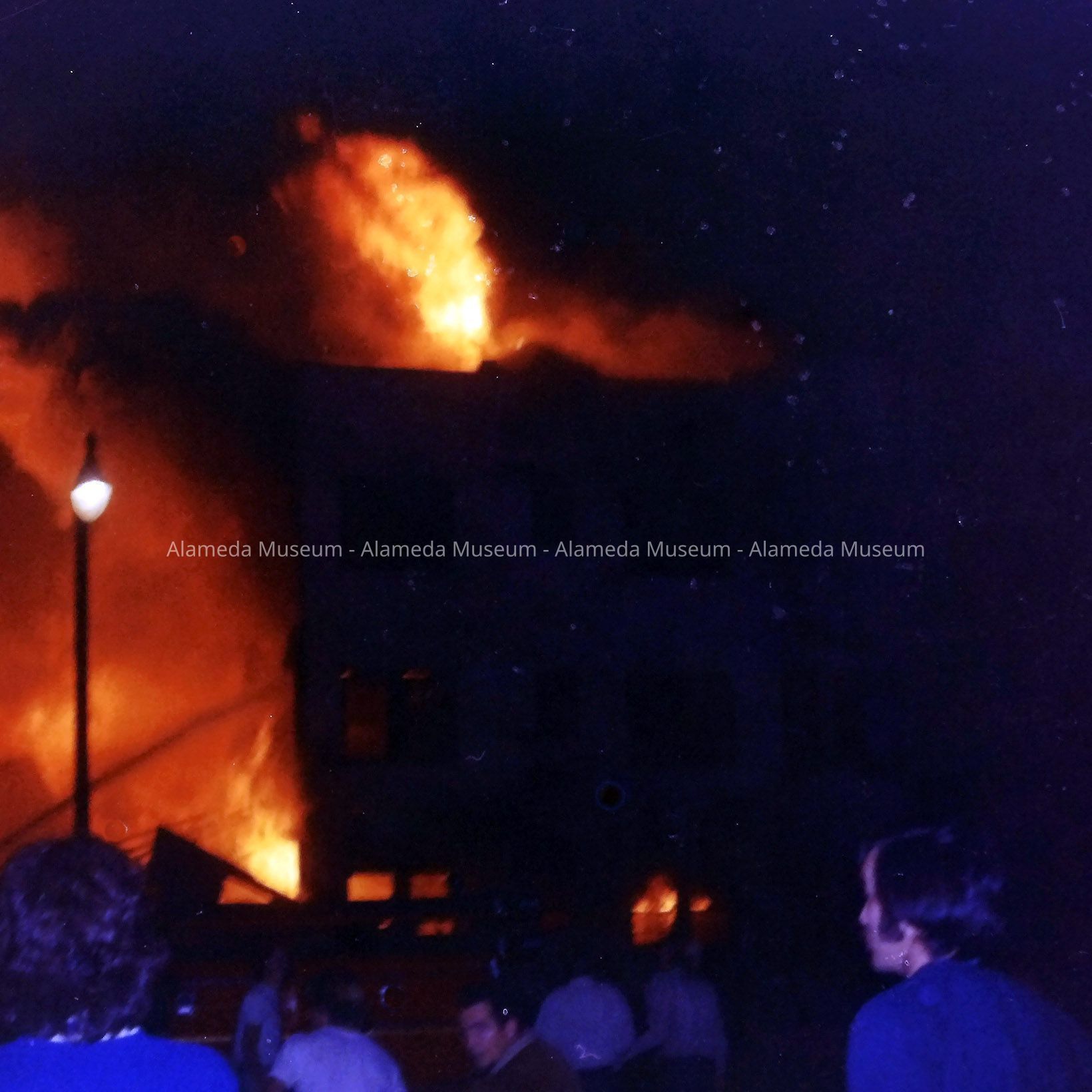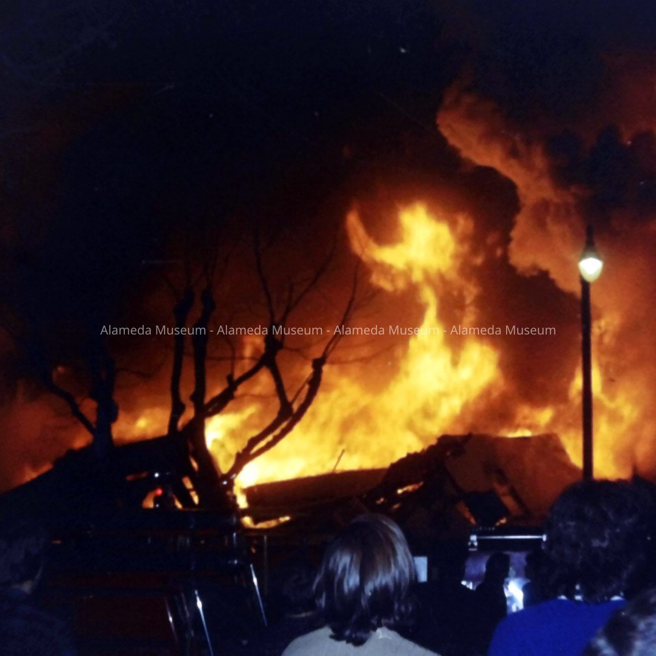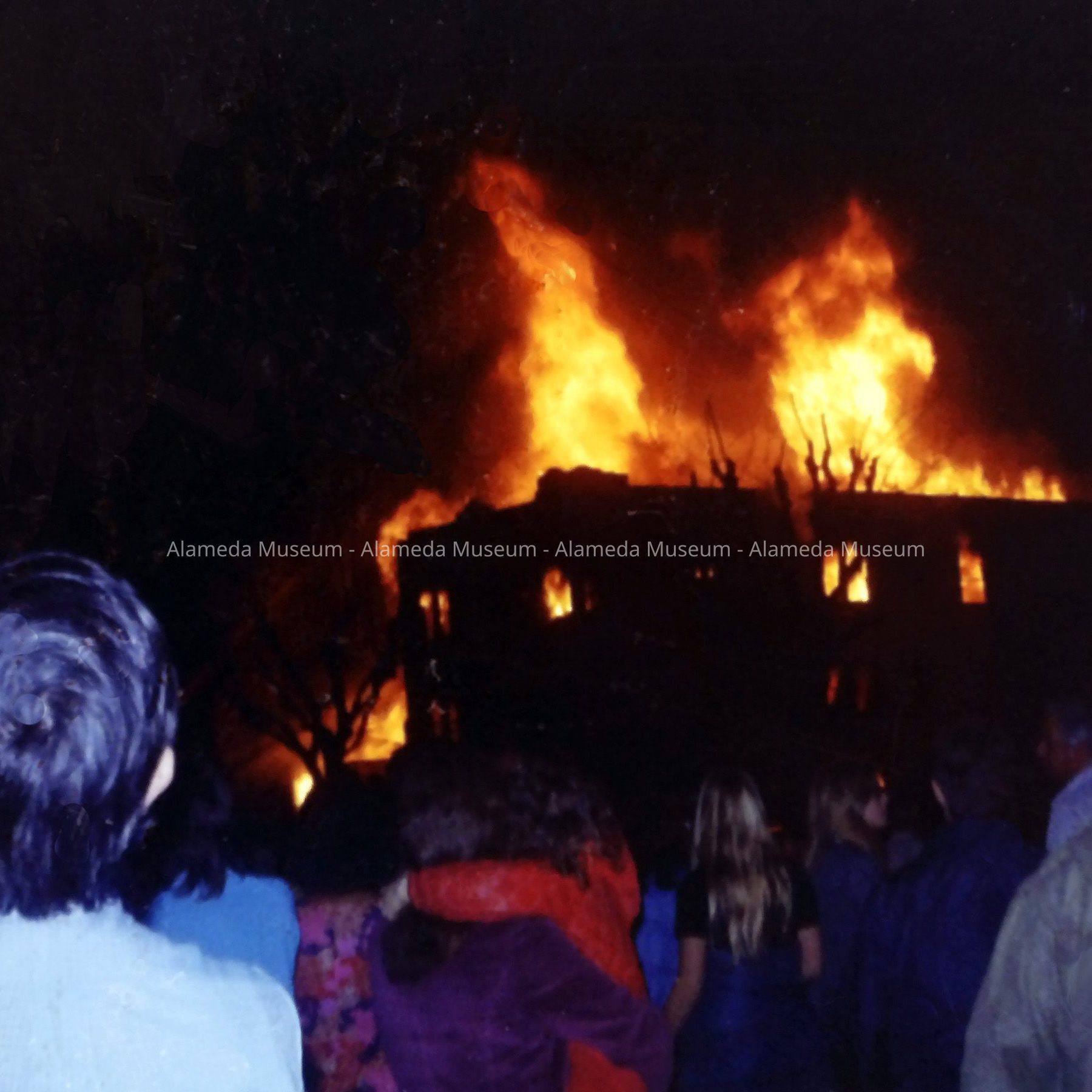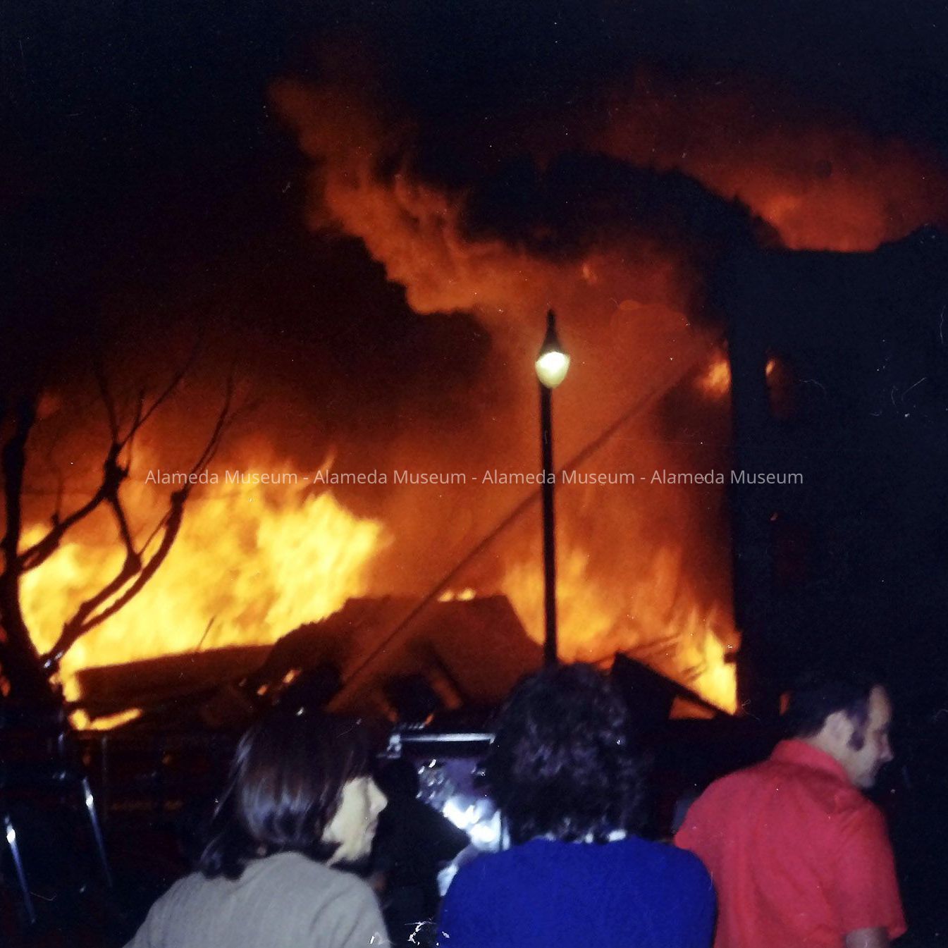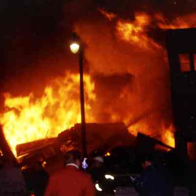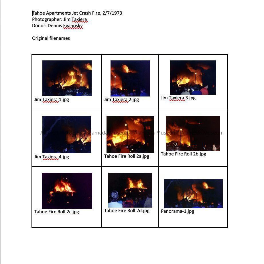 History of Object: Images of the fire resulting from a Navy Corsair A-7E Jet crashing into the multi-story Tahoe Apartments Building at 1814 Central Ave, at 8:13 p.m. on February 7, 1973. The photos were scanned and processed to digital format by the donor after receiving them from the original photographer, Jim Taxiera. (See 25.33.1).