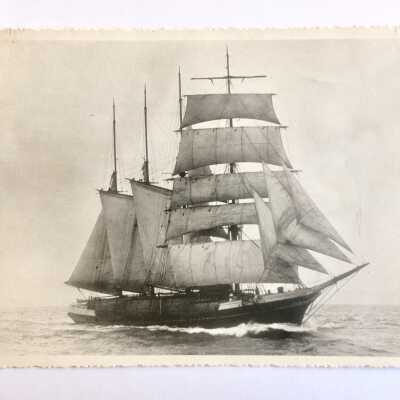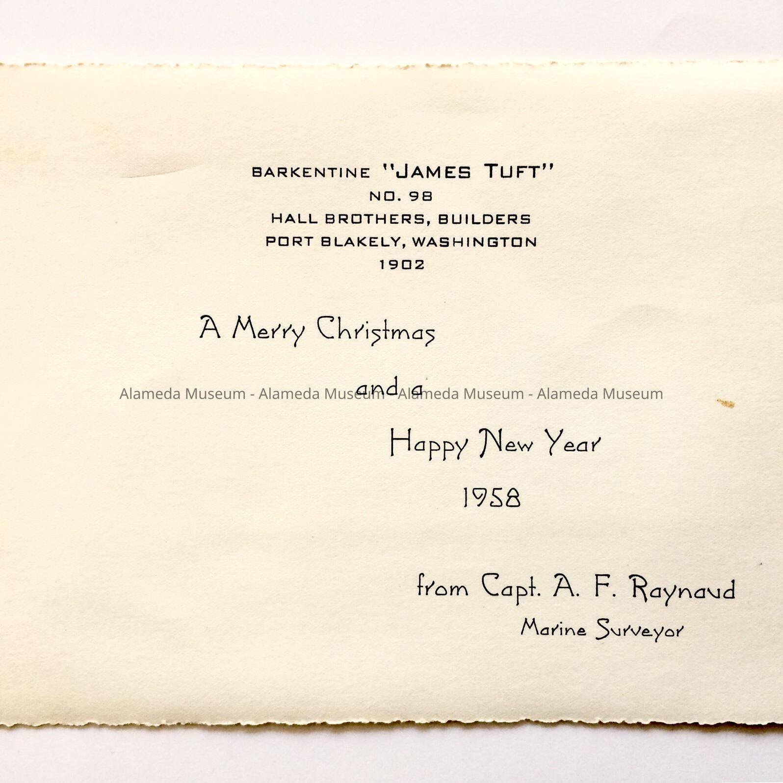 B. large-size postcard with scalloped edge, showing a sepia photo of the ship at an angle with top sails furled, on verso: Barkentine "James Tuft", No. 98, Hall Brothers, Builders, Port Blakely, Washington, 1902; A Merry Christmas and Happy New Year, 1958, from Capt. A.F. Raynaud, Marine Surveyor.