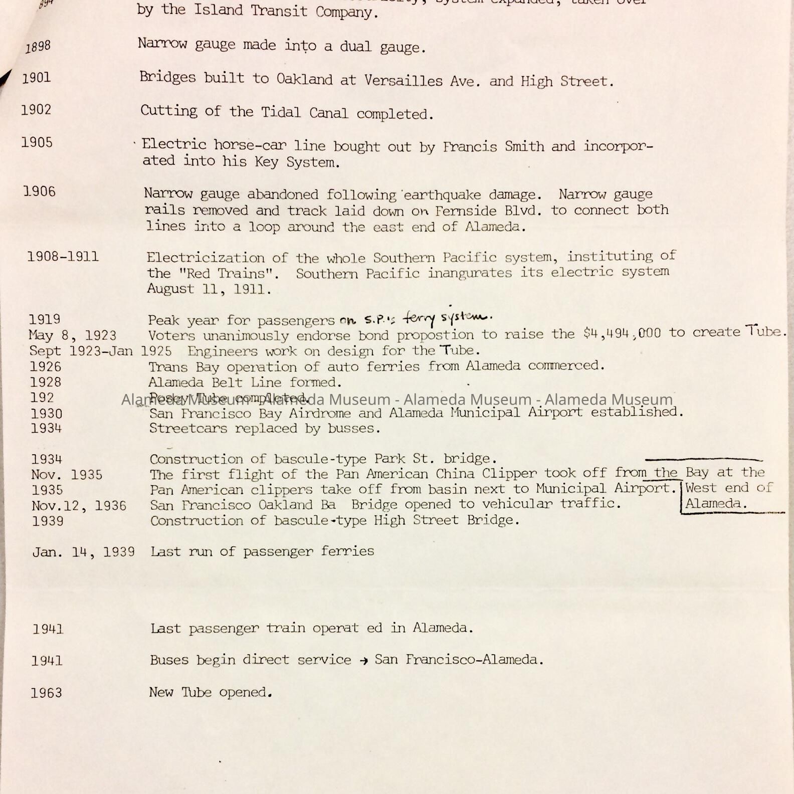 Description: Three pages of typed photocopied chronology with handwritten caption, "Important Transportation Dates in Alameda (draft)".
