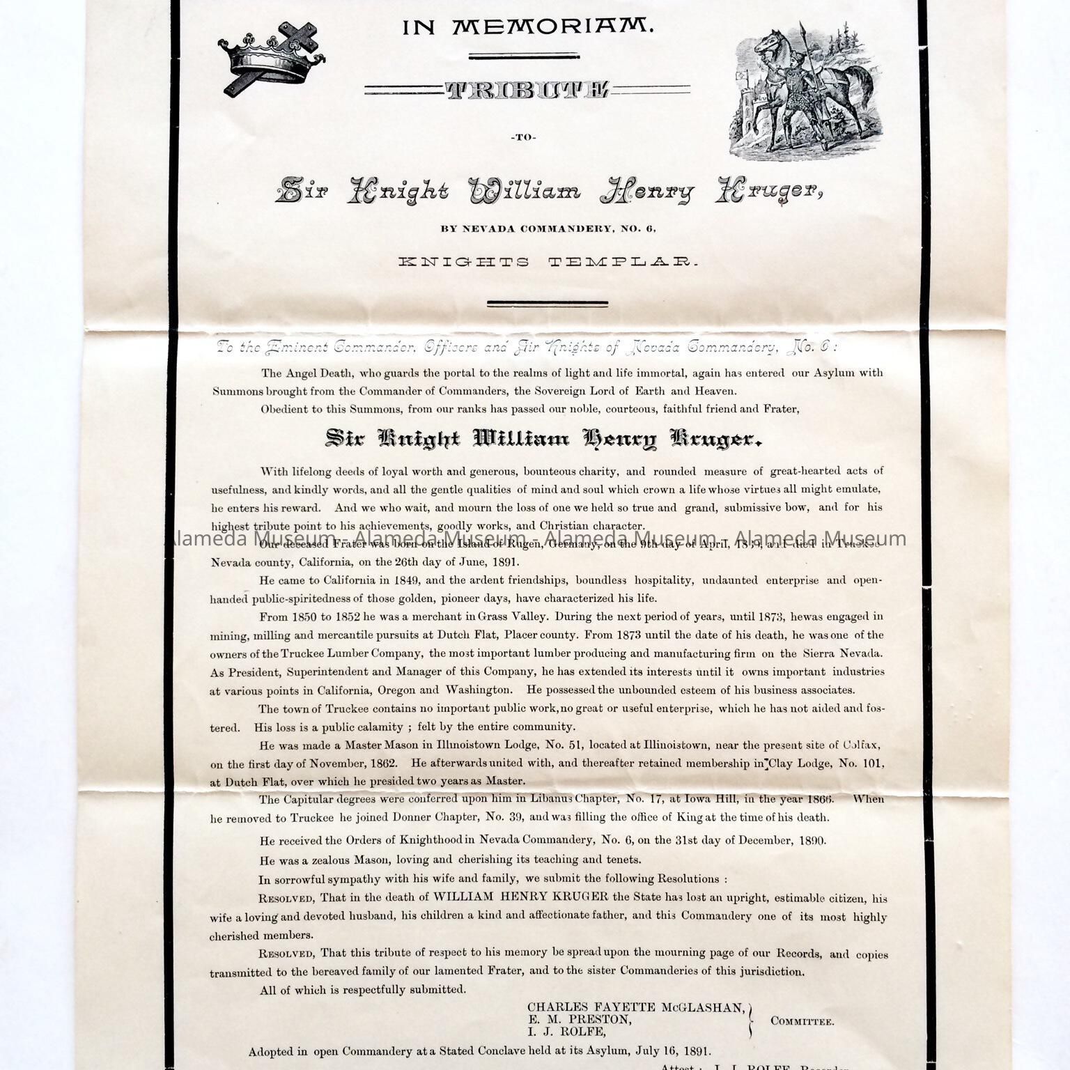 Memoriam issued by the Nevada Commandery, No. 6., Knights Templar (Masonic Lodge), concerning the death of Wm. Henry Kruger, Alameda resident.