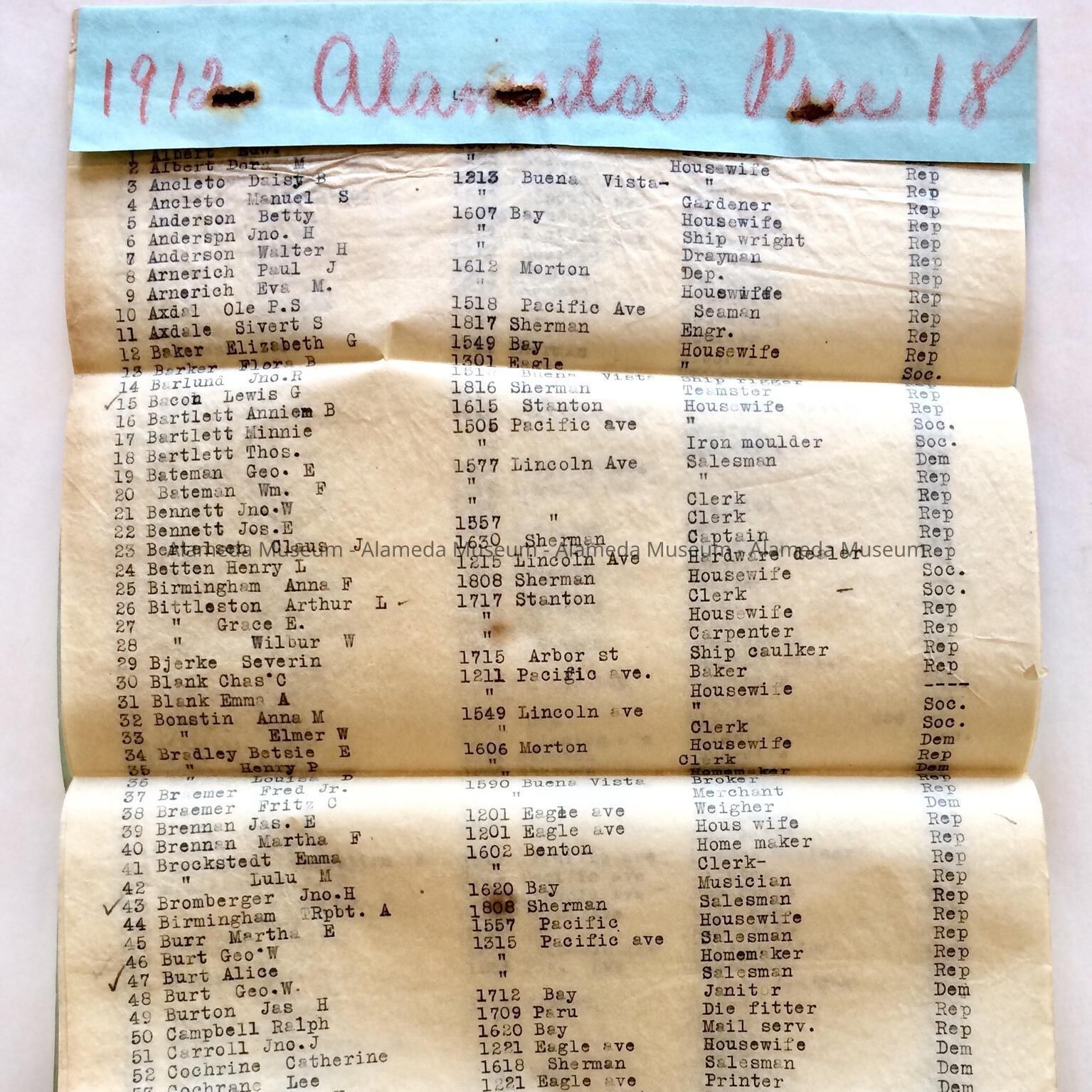 INDEX LIST TO THE GREAT REGISTER, 1912, CITY OF ALAMEDA, 18th PRECINCT (NORTH SIDE AREA) LIST OF VOTERS, THEIR ADDRESSES, OCCUPATIONS & PARTY.