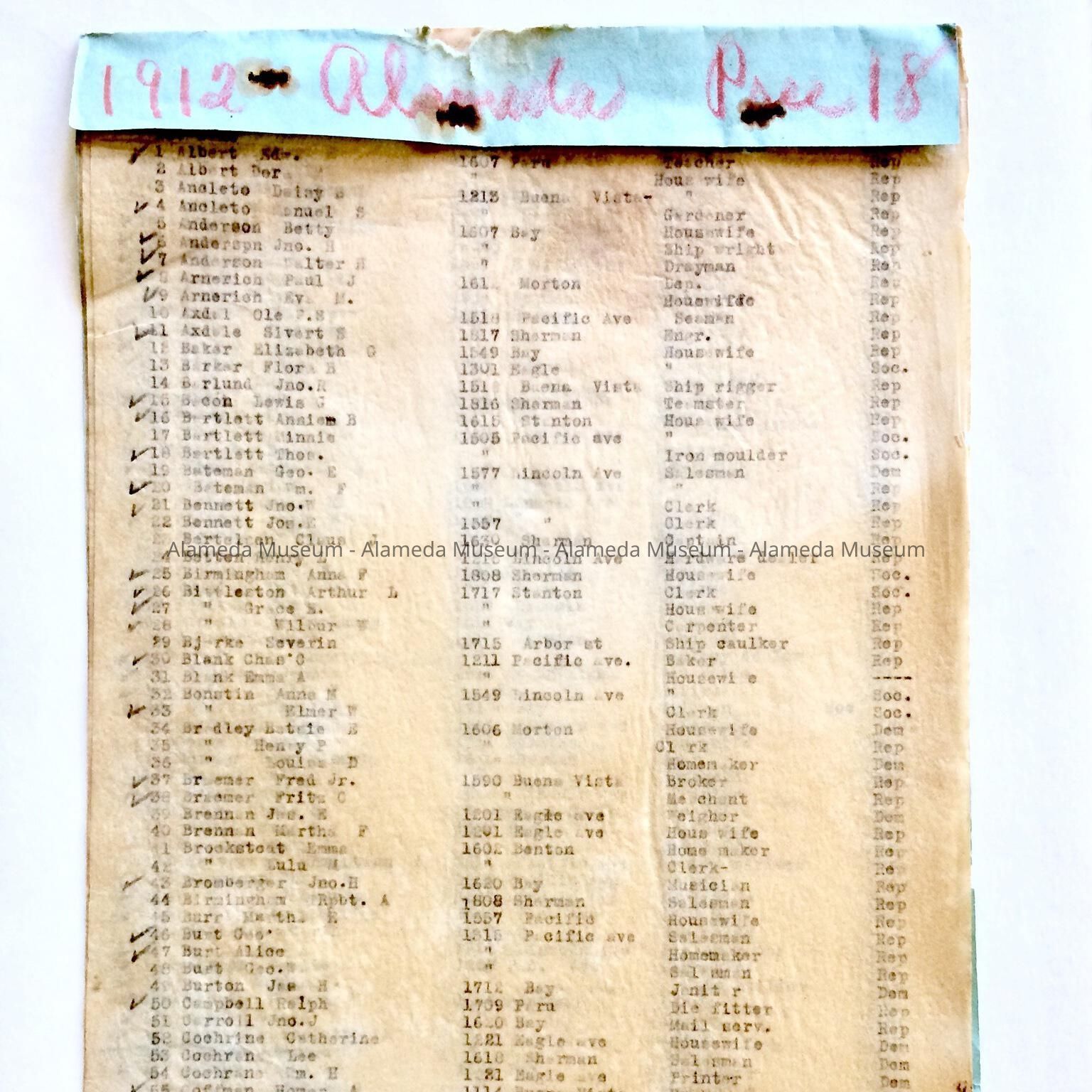HISTORY OF OBJECT: LIST OF VOTERS, ADDRESSES, OCCUPATIONS & PARTY, INDEX TO GREAT REGISTER, 18th PRECINCT, 1912