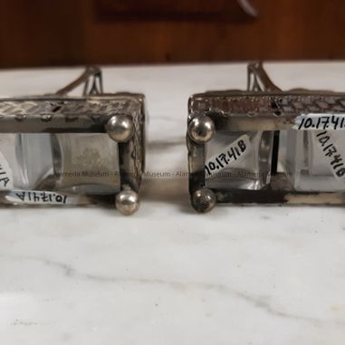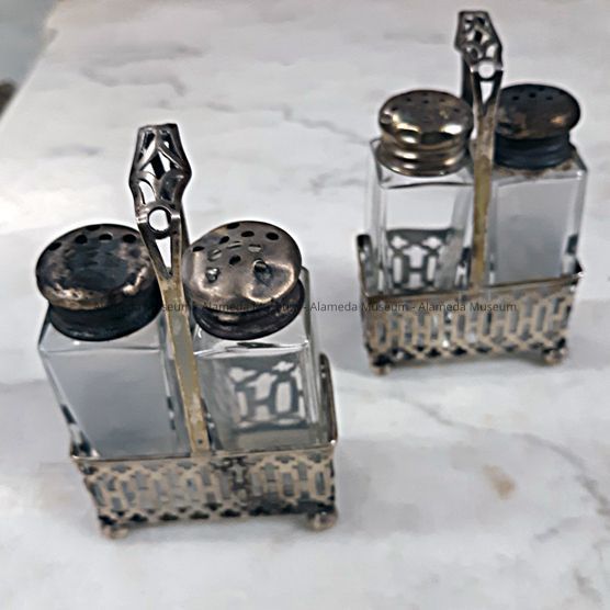 DESCRIPTION: INDIVIDUAL CASTERS CONSISTING OF CLEAR GLASS SALT AND PEPPER BOTTLES WITH SILVER SCREW TOP LIDS ON A STERLING SILVER STAND. STAND IS IN A BASKET FORM SUPPORTED BY FOUR BALL FEET. BASKET HAS OPEN WORK DESIGN.