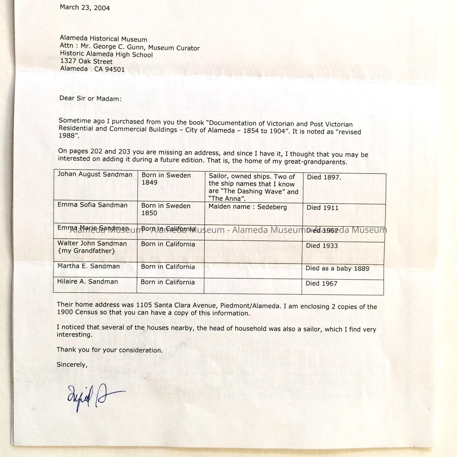 INFORMATION COMPILED BY THE DONOR CONCERNING THE JOHAN AUGUST SANDMAN FAMILY OF 1105 SANTA CLARA AVENUE IN ALAMEDA. MR SANDMAN WAS A SAILOR AND OWNED TWO SHIPS. THE INFORMATION INCLUDES OTHER FAMILY MEMBERS' NAMES AND DATES OF THEIR DEATHS.