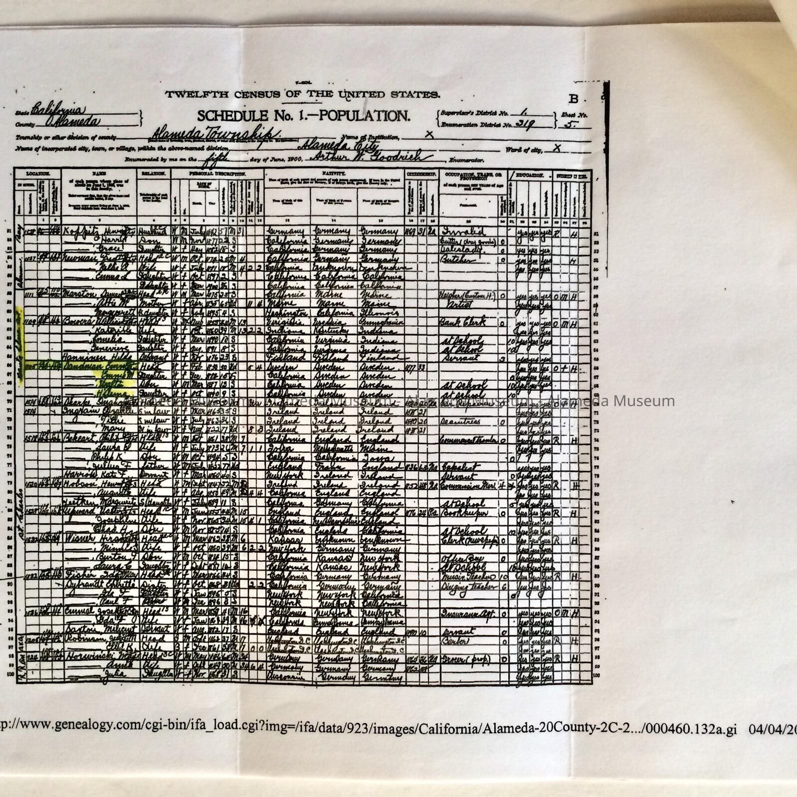 A TYPEWRITTEN LETTER REPRODUCED SHEETS FROM THE TWELFTH CENSUS OF THE UNITED STATES IN 1900.