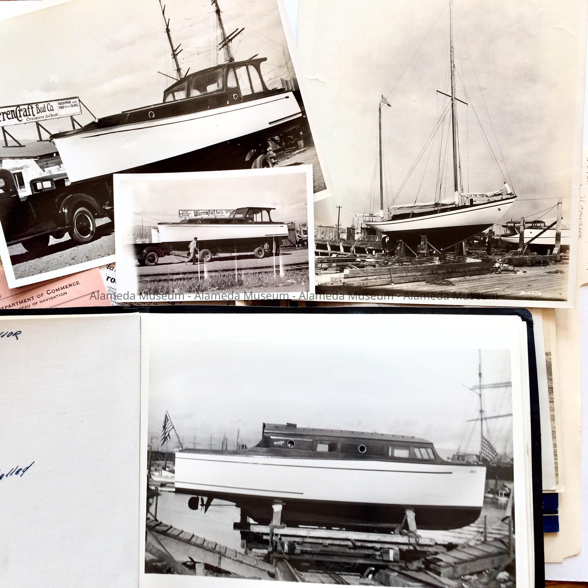 Description: A folder containing blueprints, literature and photographs connected with the Warren Boat Co. (aka Warrencraft Boat Co.), 1535 Buena Vista Ave. The photograph album consisting of 19 pages of b/w photos of various sizes of pleasure craft, the photographer was Ford E. Samuel, Oakland (who was an Alameda resident and, eventually, its postmaster).