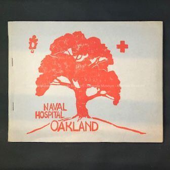 SOFT-COVER BOOKLET, WITH COVER DESIGN WHICH APPEARS TO BE SILK-SCREENED IN RED-COLORED PAINT. DESIGN CONSISTS OF AN OAK TREE, WITH THE CAPTION, "NAVAL HOSPITAL, OAKLAND."