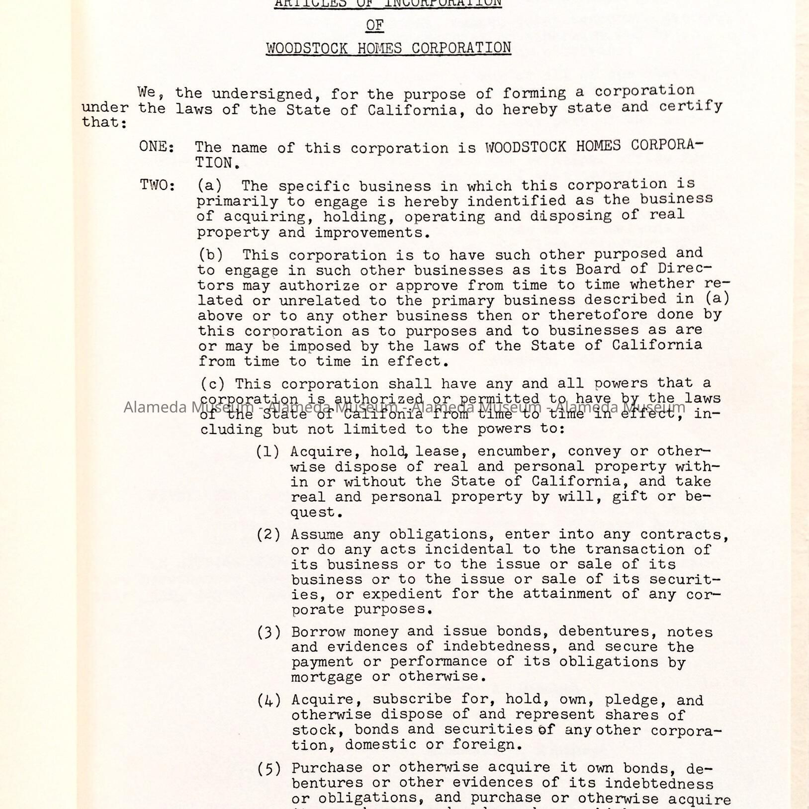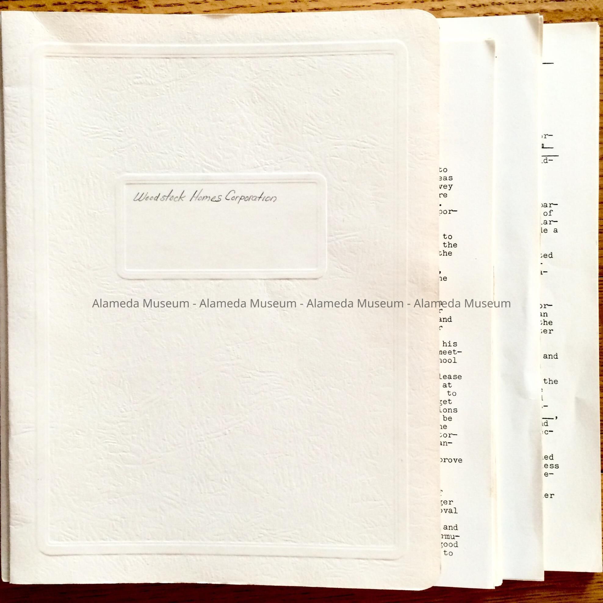 HISTORY OF OBJECT: GENERAL INFORMATION AND ARTICLES OF INCORPORATION OF THE WOODSTOCK HOMES CORPORATION, WEST END, ALAMEDA. ALSO INCLUDED ARE BY-LAWS.