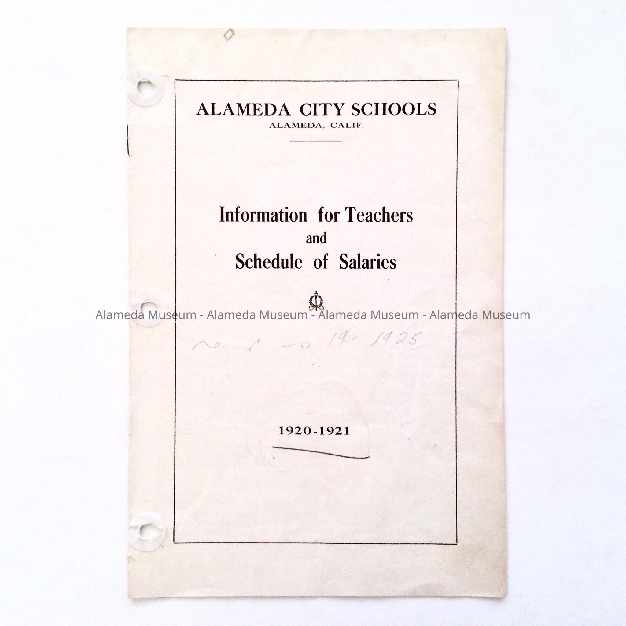 History of Object: Pamphlet containing information for teachers and schedule of salaries, issued by the Alameda City Schools, for the period 1920-21.