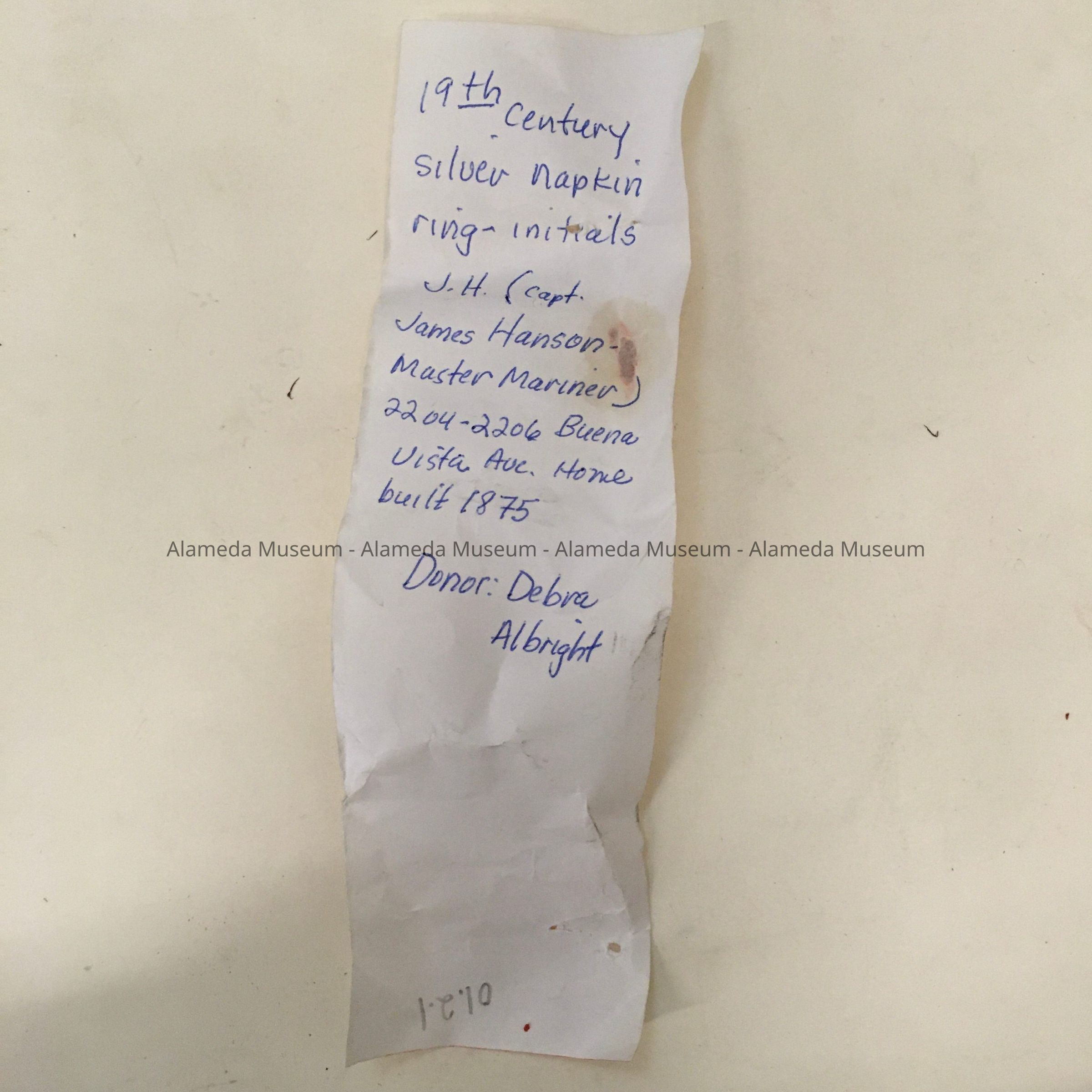 History: Napkin ring belonging to James Hanson, Master Mariner, 2204-06 Buena Vista Avenue. Home was built in 1875 and is still standing.
