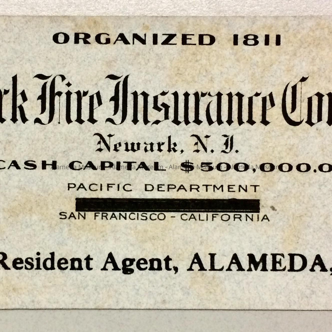 ADVERTISING INK BLOTTER FOR THE NEWARK FIRE INSURANCE COMPANY; E C WOOD, RESIDENT AGENT, ALAMEDA, CAL.