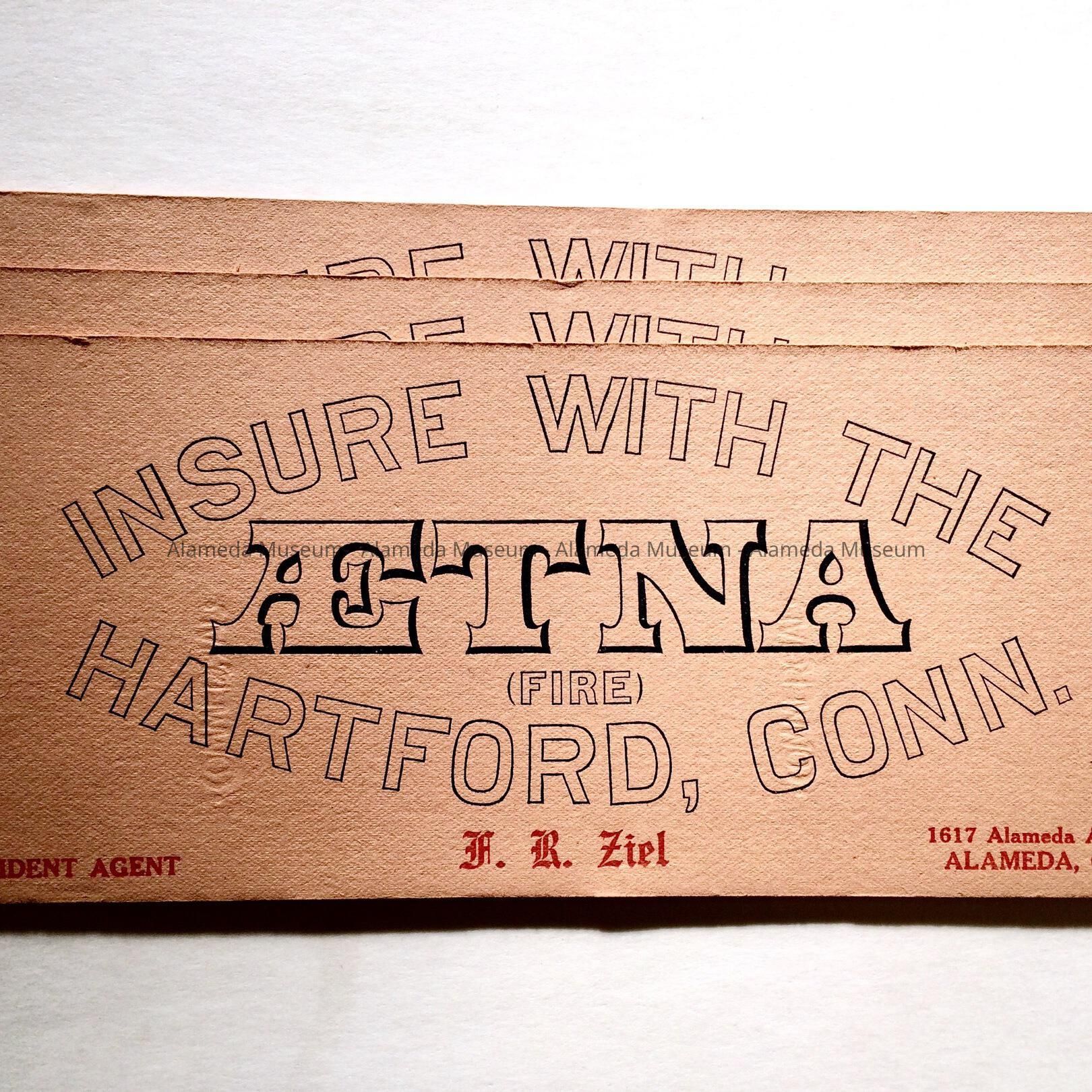 INK BLOTTERS ADVERTISING ETNA FIRE INSURANCE CO., FR ZIEL, RESIDENT AGENT, 1617 ALAMEDA AVENUE, ALAMEDA, CA.