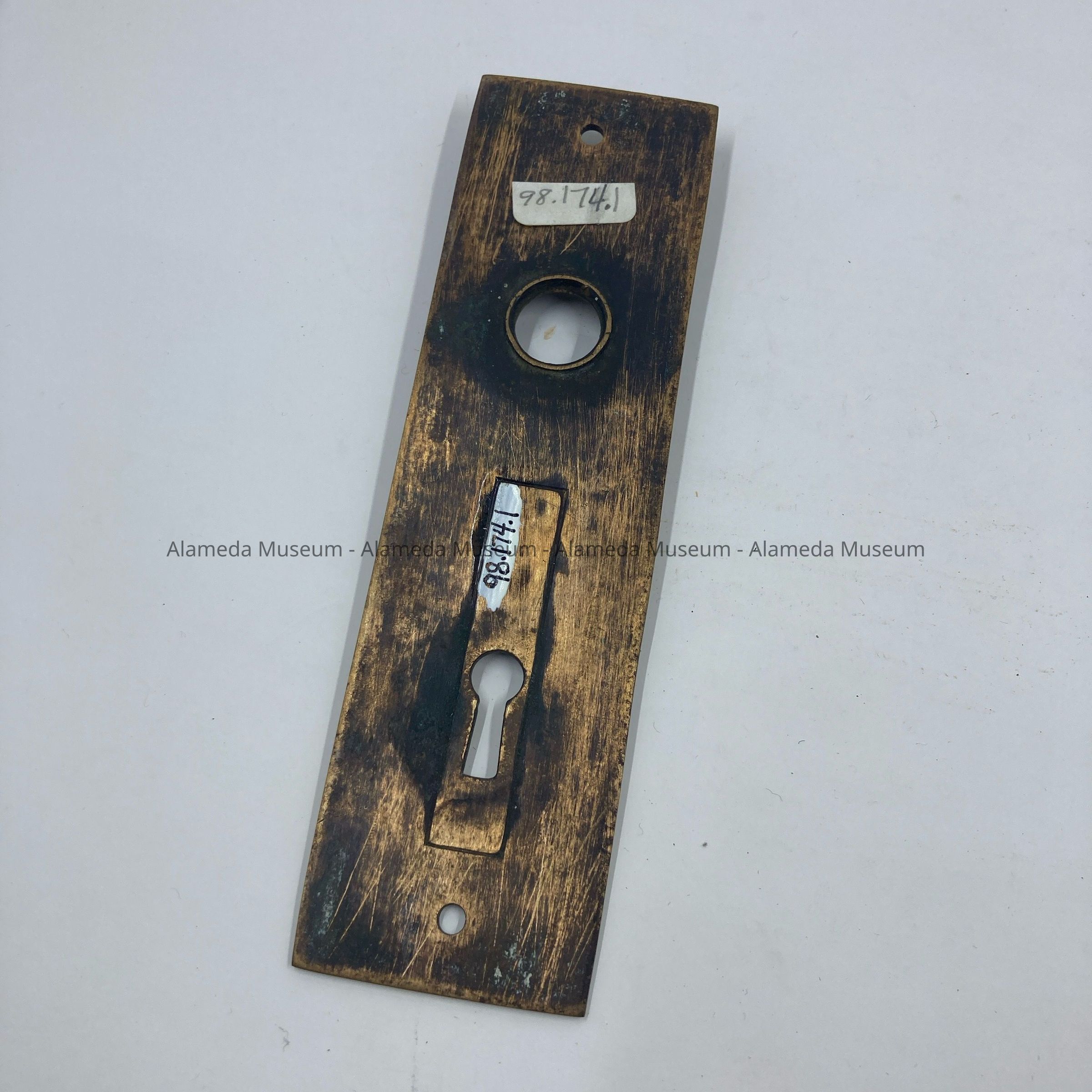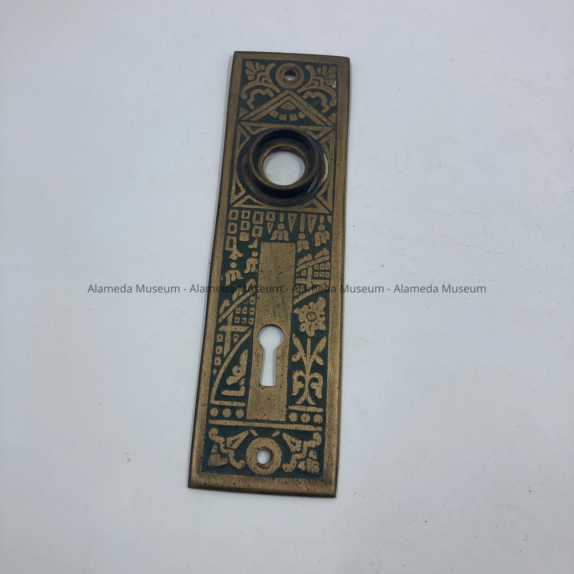 INTERIOR CAST BRASS RECTANGULAR-SHAPED DOOR ESCUTCHEON, WHICH HAS DOUBLE HOLES FOR ATTACHING BY SCREWS. IT ALSO HAS A CIRCULAR OPENING, WITH A FLANGE AS A RECEPTACLE FOR A DOOR KNOB. A SINGLE KEY HOLE OPENING IS ALSO FEATURED. FACE OF ESCUTCHEON HAS ELABORATE INCISED DESIGNS IN THE EAST LAKE STYLE.