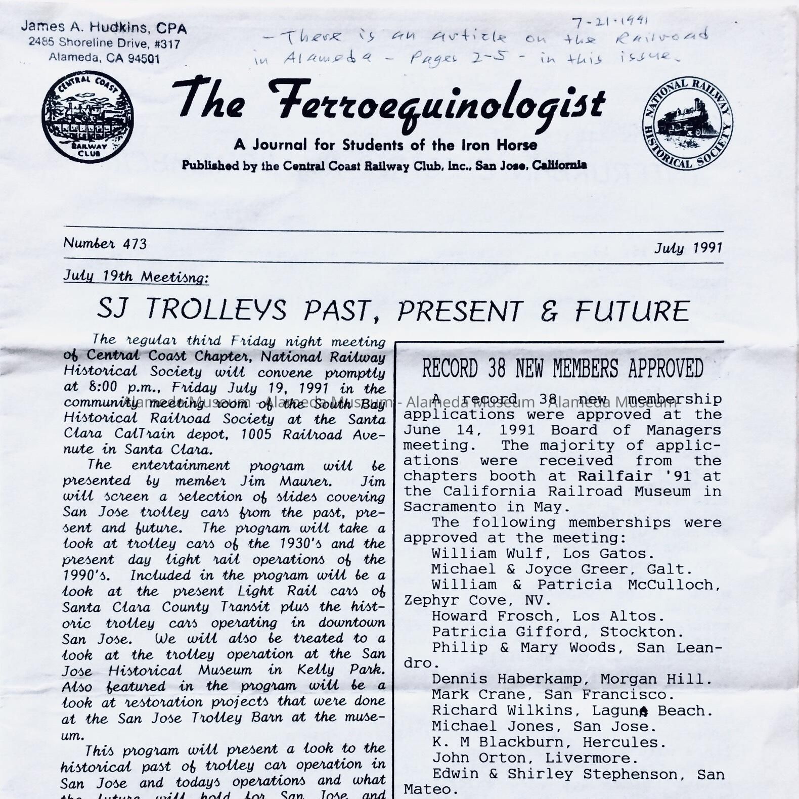 Description: 4 page, unbound, booklet, titled 'The Ferroequinologist', number 473 of July 1991. Includes business card of addressee (stamped in top left).