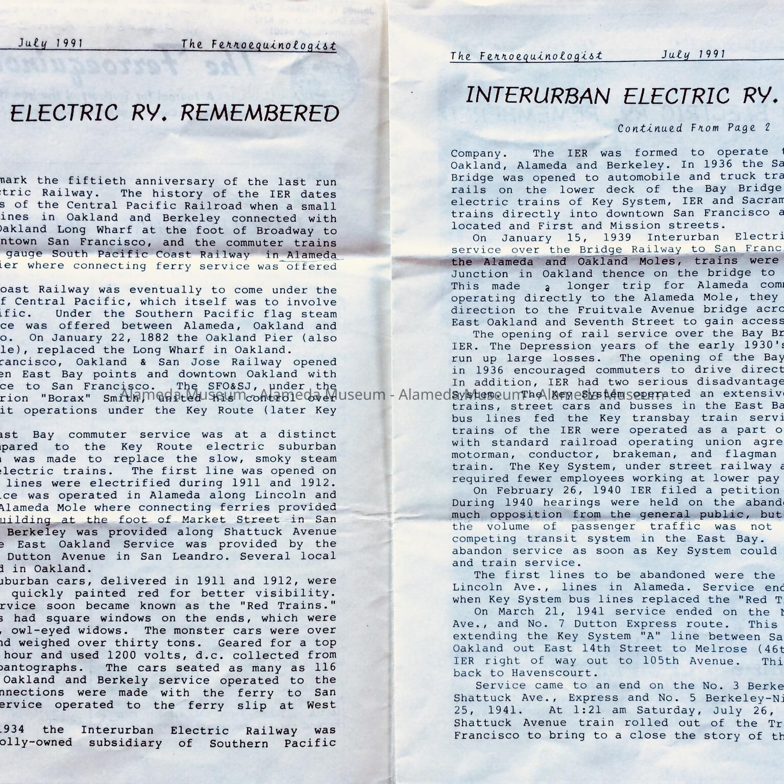 History of Object: newsletter of the Central Coast Railway Club, Inc., San Jose, with 2-page history article, including center-spread images, on the occasion of the 50th anniversary of the last run of the Interurban Electric Railway, July 26, 1941.