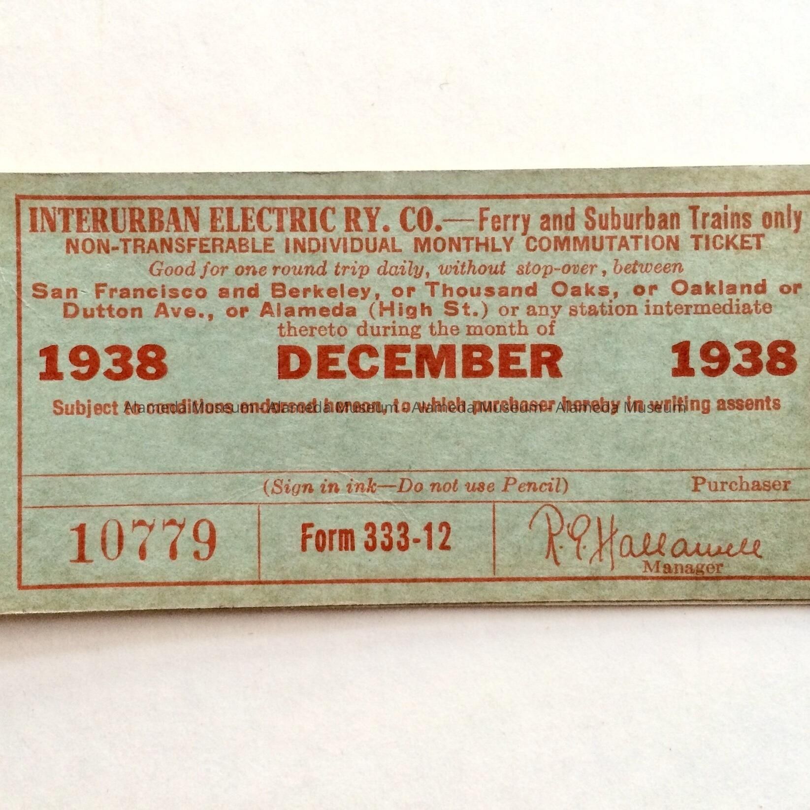 History of Object: Electric train tickets, dated 1938, for San Francisco, Berkeley, Oakland or Alameda, ferry and suburban trains only.