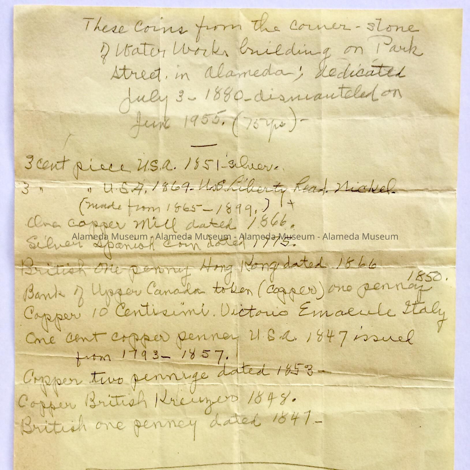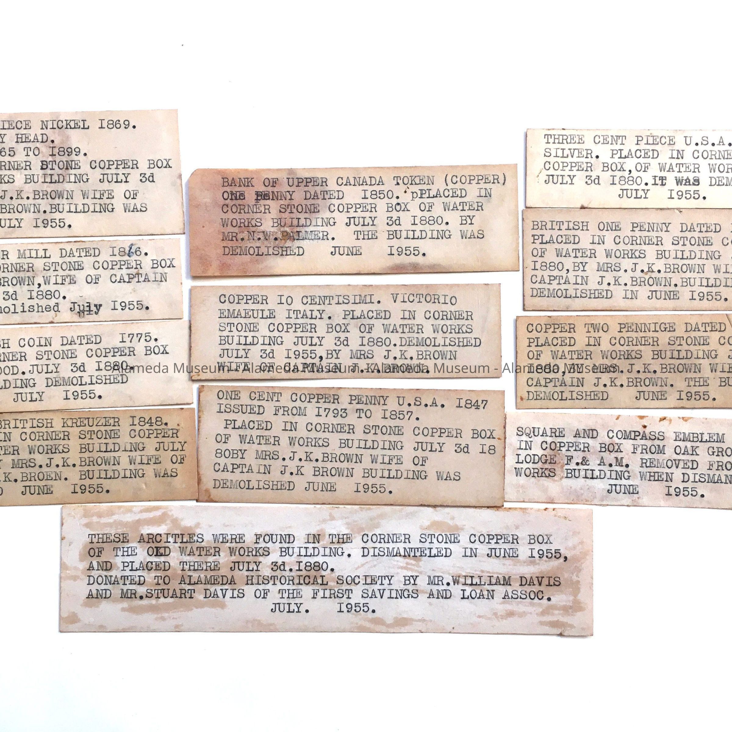 Inventory which appears to be in the handwriting of the late Myrtle Richards, curator of the Alameda Historical Society, of the coins found in the cornerstone of the Waterworks Building on Park Street, between Santa Clara and Central Avenue. Demolished in June, 1955.