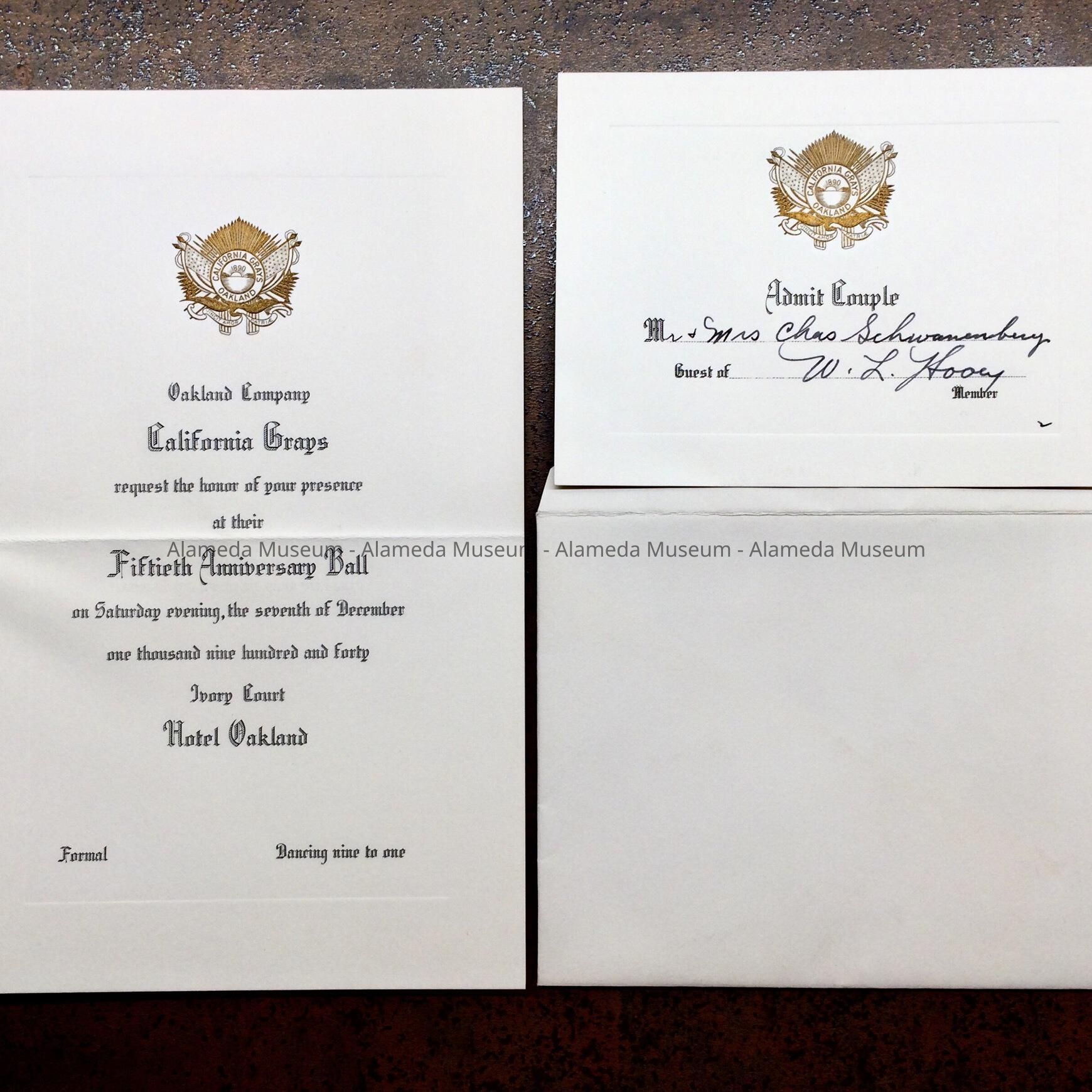HISTORY OF OBJECTS: INVITATION AND ADMITTANCE CARD DISPLAYING ELABORATE GOLD-PRINTED INSIGNIA, "GRAYS, OAKLAND." INVITATION WAS ADDRESSED TO MR. AND MRS. CHARLES SCHWANENBERG, CITY MANAGER, TO AN EVENT IN OAKLAND BY THE OAKLAND COMPANY, CALIFORNIA GRAYS.