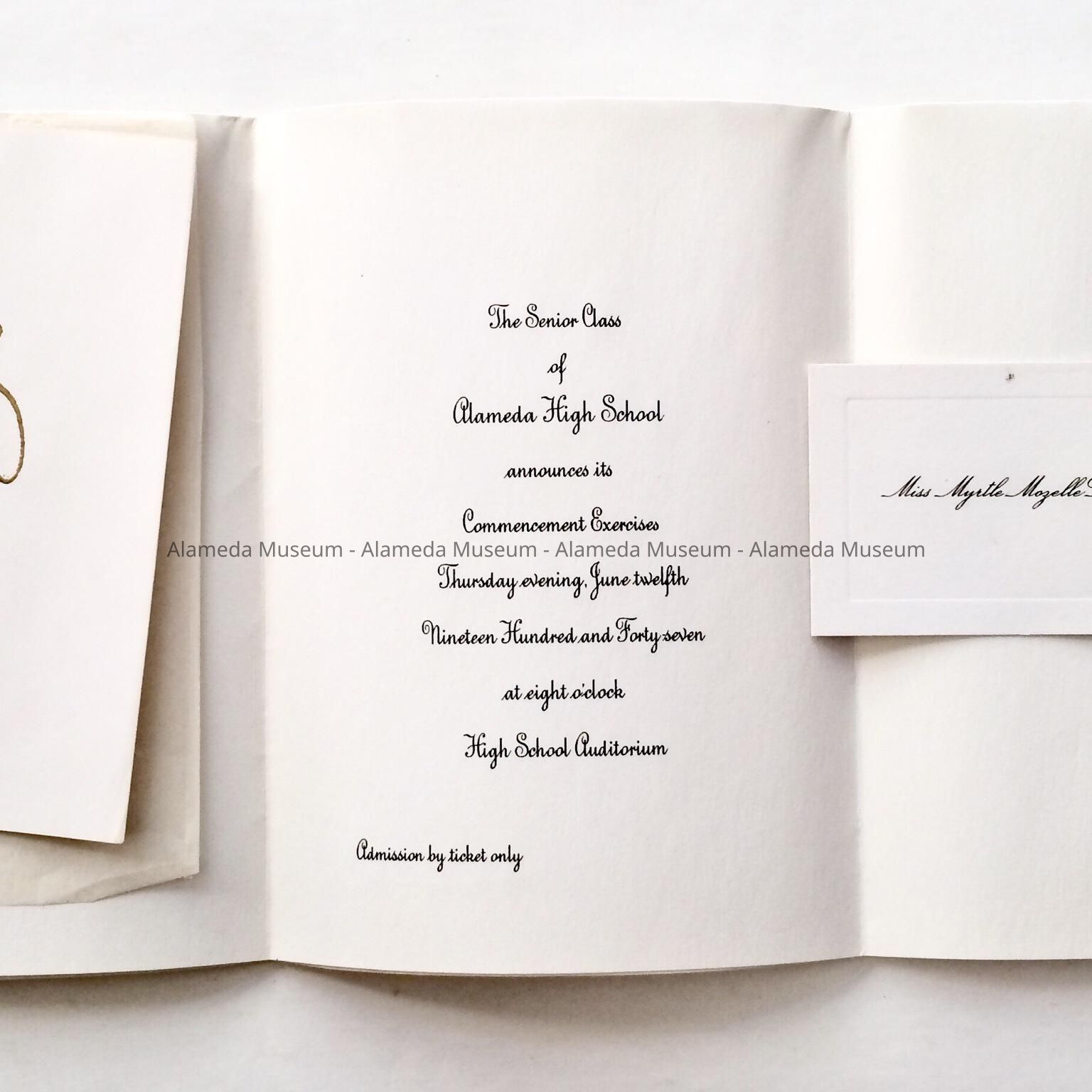 AN INVITATION TO THE SENIOR CLASS COMMENCEMENT EXERCISE FOR JUNE 12, 1947, ALAMEDA HIGH SCHOOL. THE INVITATION WAS ISSUED BY MRS MYRTLE M GRAHAM.