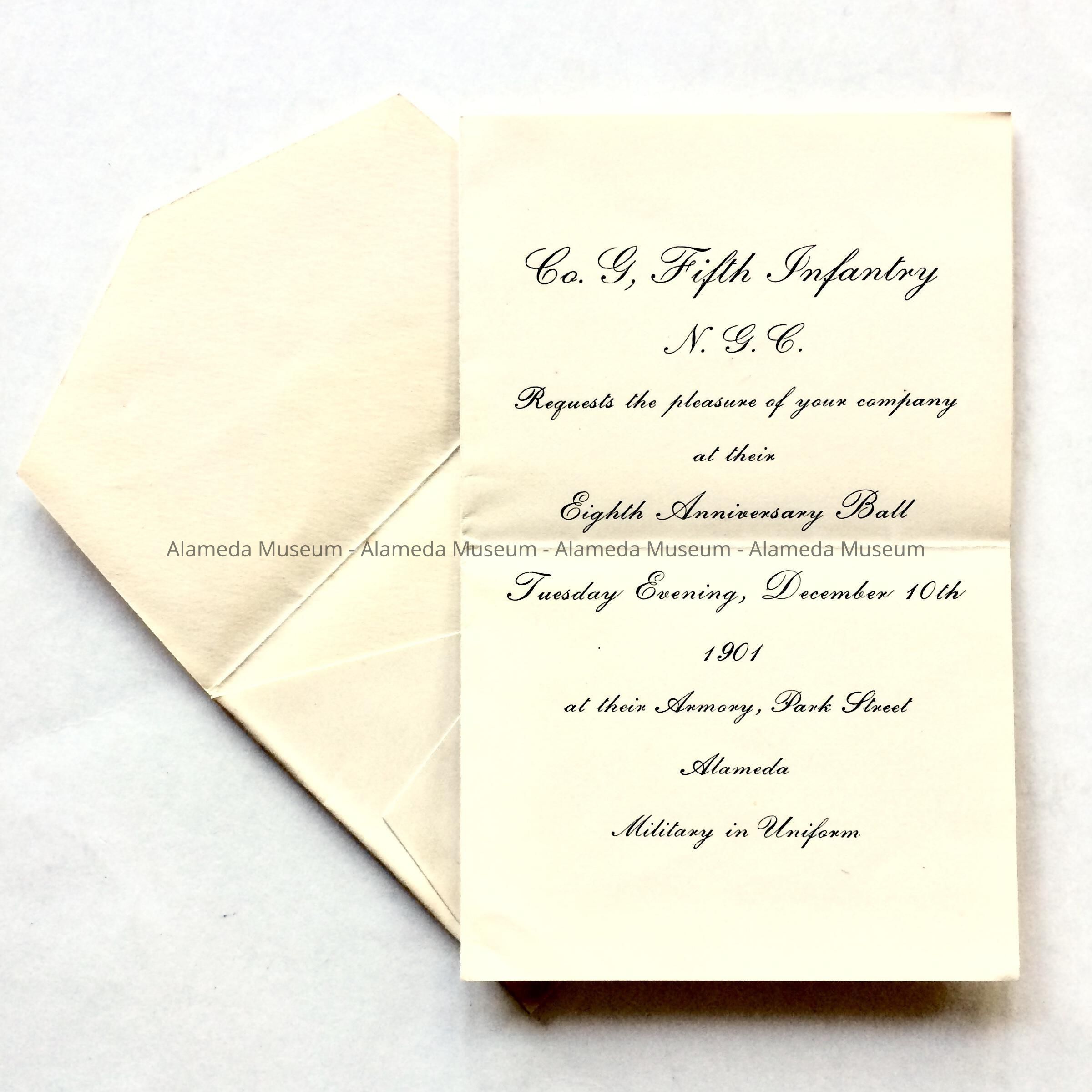 INVITATION TO AN ANNIVERSARY BALL, GIVEN BY COMPANY "G," 5th INFANTRY, ALAMEDA BRANCH, NATIONAL GUARD ARMORY, PARK STREET, 1901.