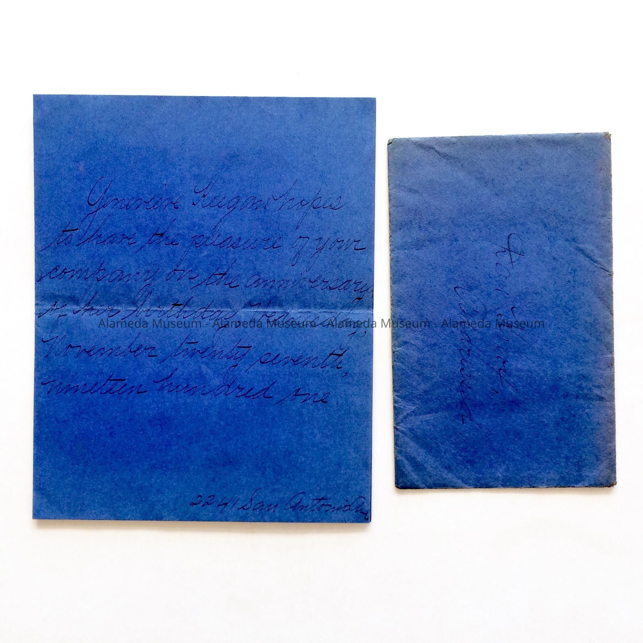 A. HANDWRITTEN INVITATION ON BLUE-COLORED STATIONERY, with MATCHING ENVELOPE.