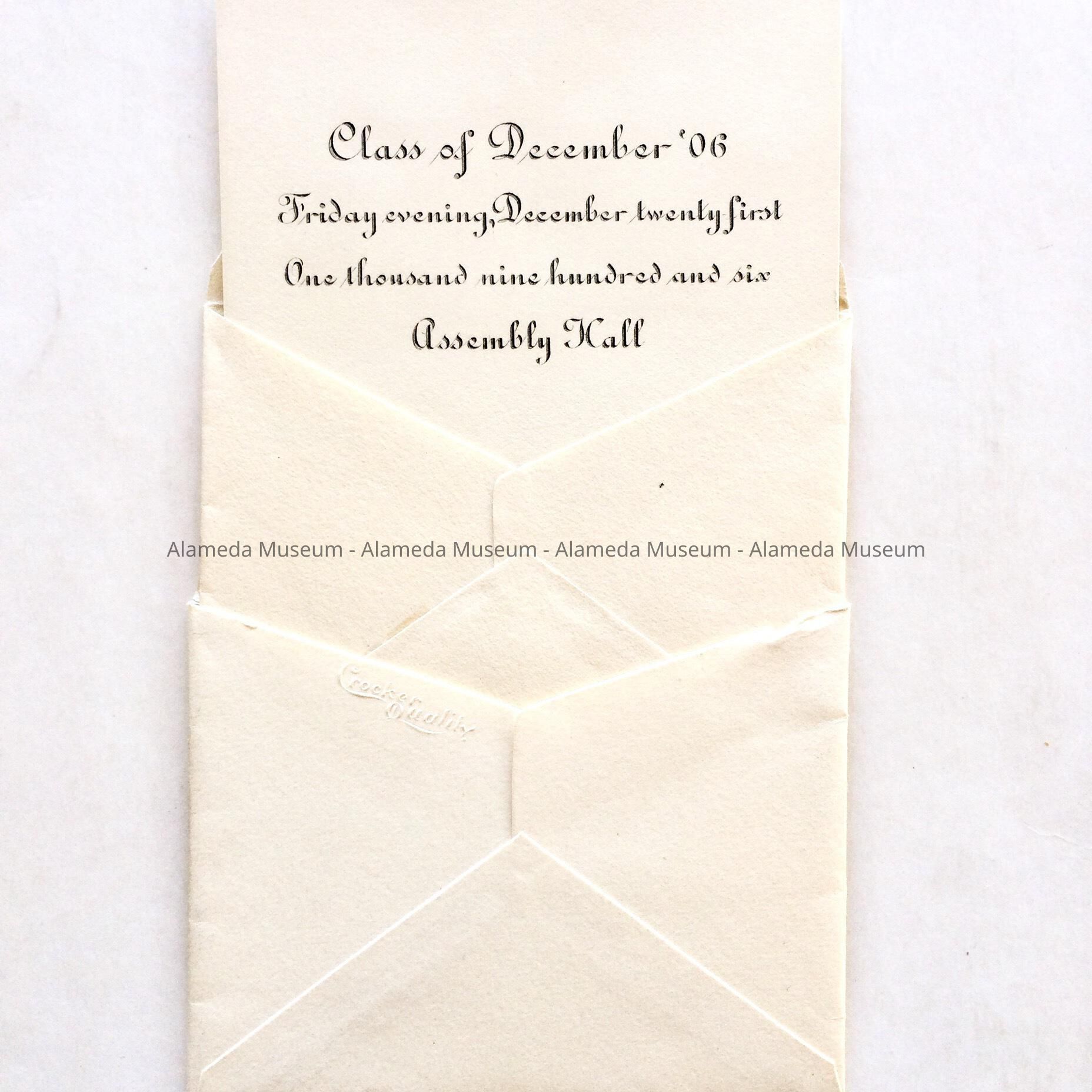 Invitation to graduation dance, Alameda High School, class of Dec, 1906. This invitation originally belonged to Edna Ethel Moulthrop, a graduate of that year. She later married Wallace Merriam, and resided at 1324 Caroline Street.