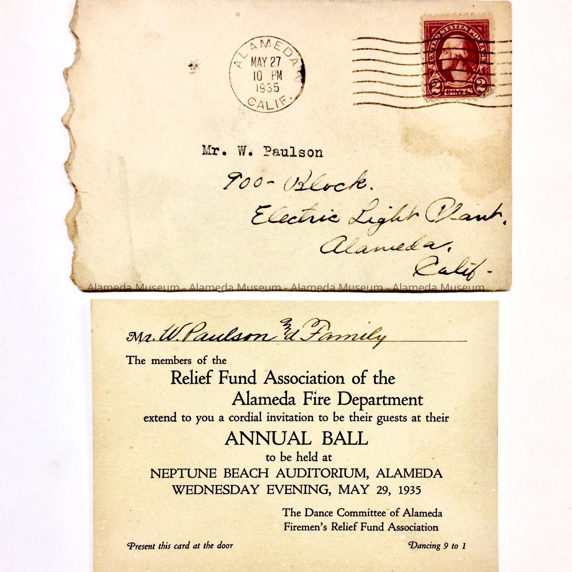 HISTORY OF OBJECTS: AN INVITATION AND ENVELOPE ADDRESSED TO W. PAULSON, INVITING HIM AND FAMILY TO A BALL ON MAY 29, 1935 FOR THE RELIEF FUND ASSOCIATION OF THE ALAMEDA FIRE DEPARTMENT. THE EVENT WAS TO BE HELD AT THE NEPTUNE BEACH AUDITORIUM IN ALAMEDA.