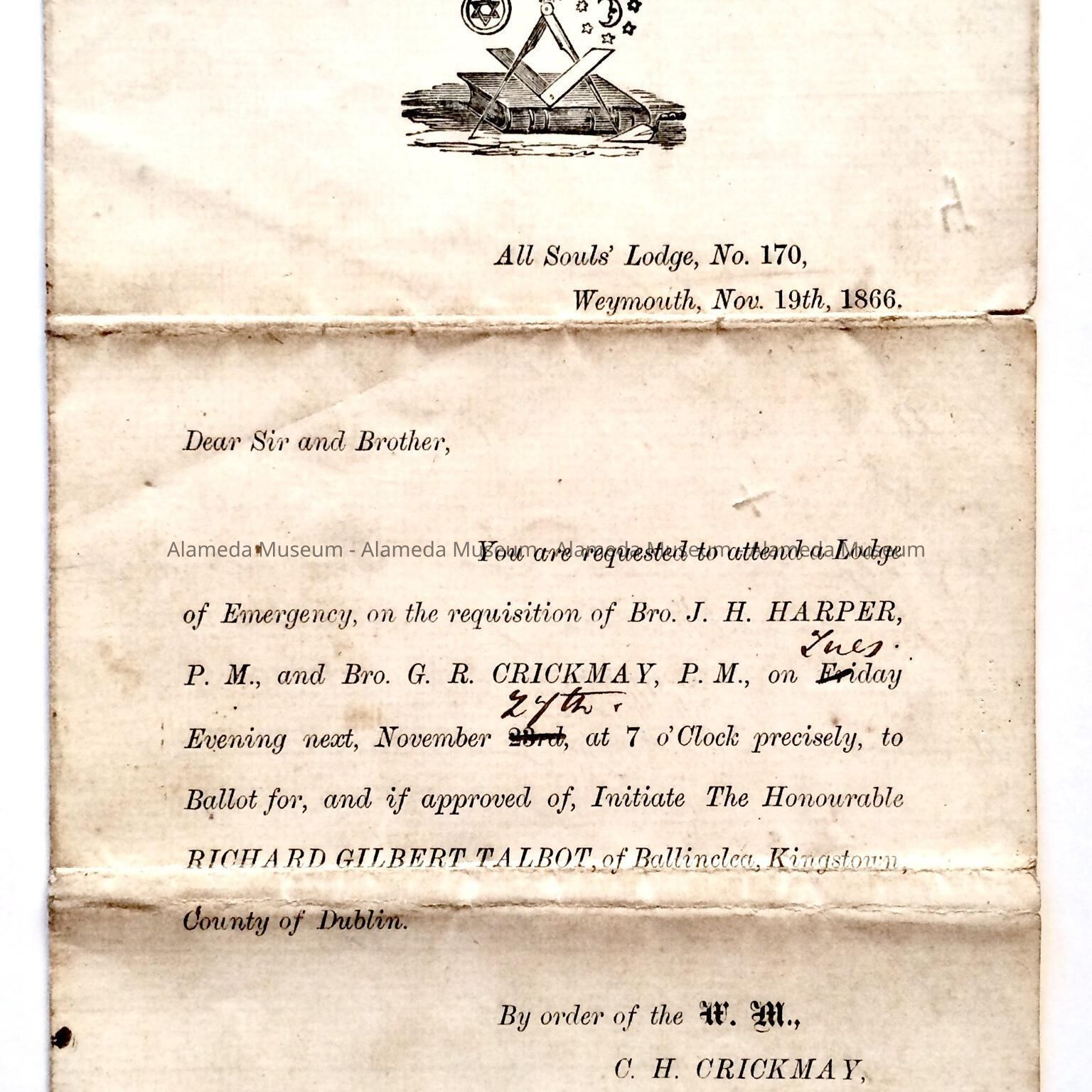 AN INVITATION REQUEST FOR A LODGE MEETING SCHEDULED FOR TUESDAY, NOVEMBER 27, 1866, IN WEYMOUTH, ENGLAND. THE LODGE WAS NAMED, "ALL SOULS LODGE NO. 170.". THE INVITATION IS HEAVILY INSCRIBED IN SEPIA-COLORED INK [PRESUMABLY BY CAPTAIN F J HUNT].