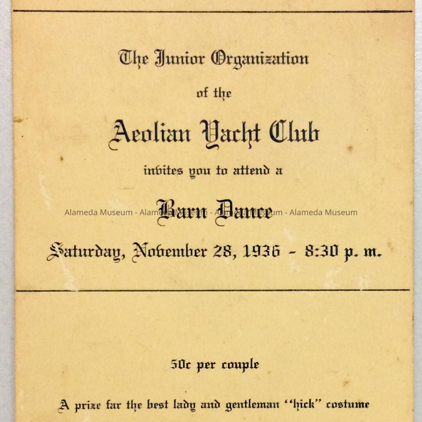 AN INVITATION TO A BARN DANCE SCHEDULED FOR NOVEMBER 28, 1936 AT THE AEOLIAN YACHT CLUB. ADMISSION WAS 50€ PER COUPLE.