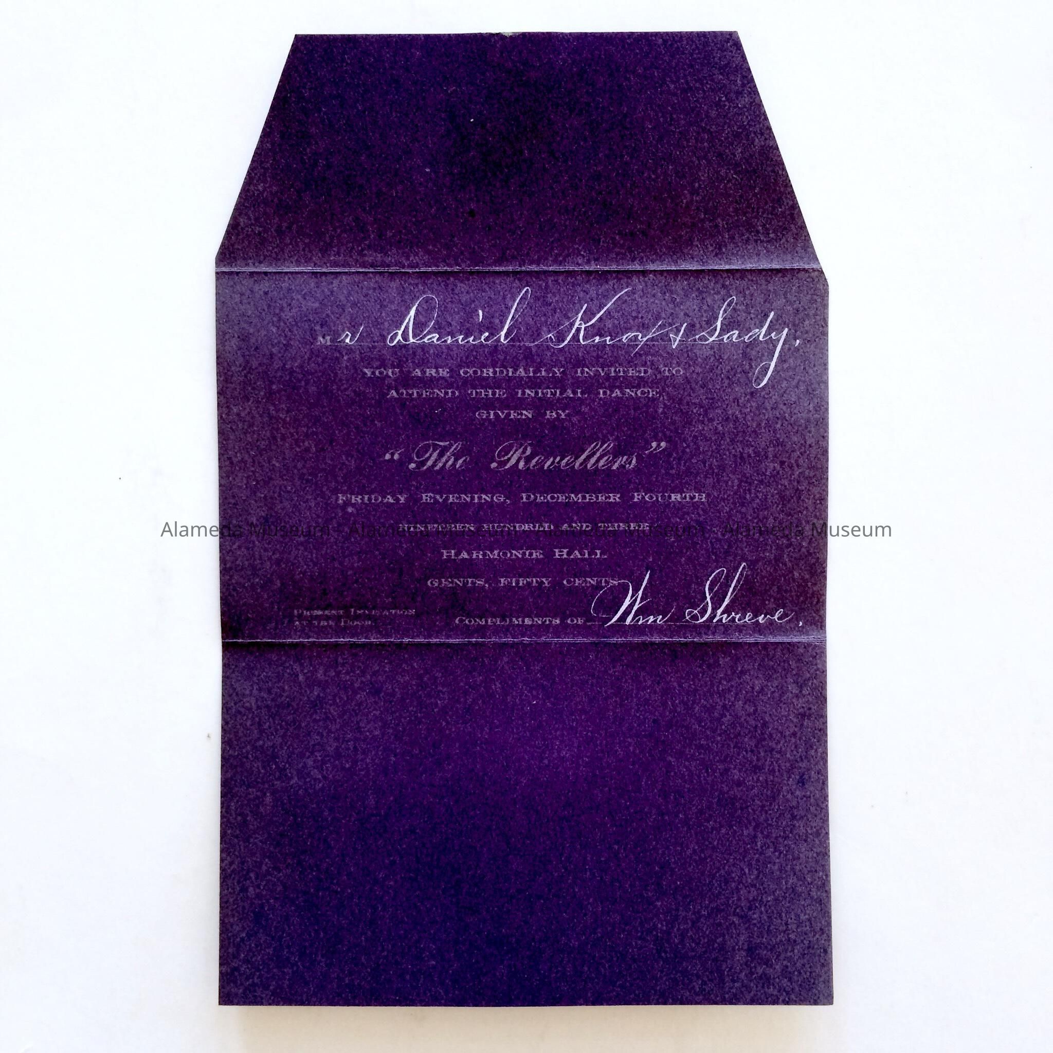 INVITATION TO DANIEL KNOX, 1184 REGENT STREET, ALAMEDA, TO A DANCE GIVEN BY THE REVELLERS, DECEMBER 4, 1903, AT HARMONIE HALL, ALAMEDA.