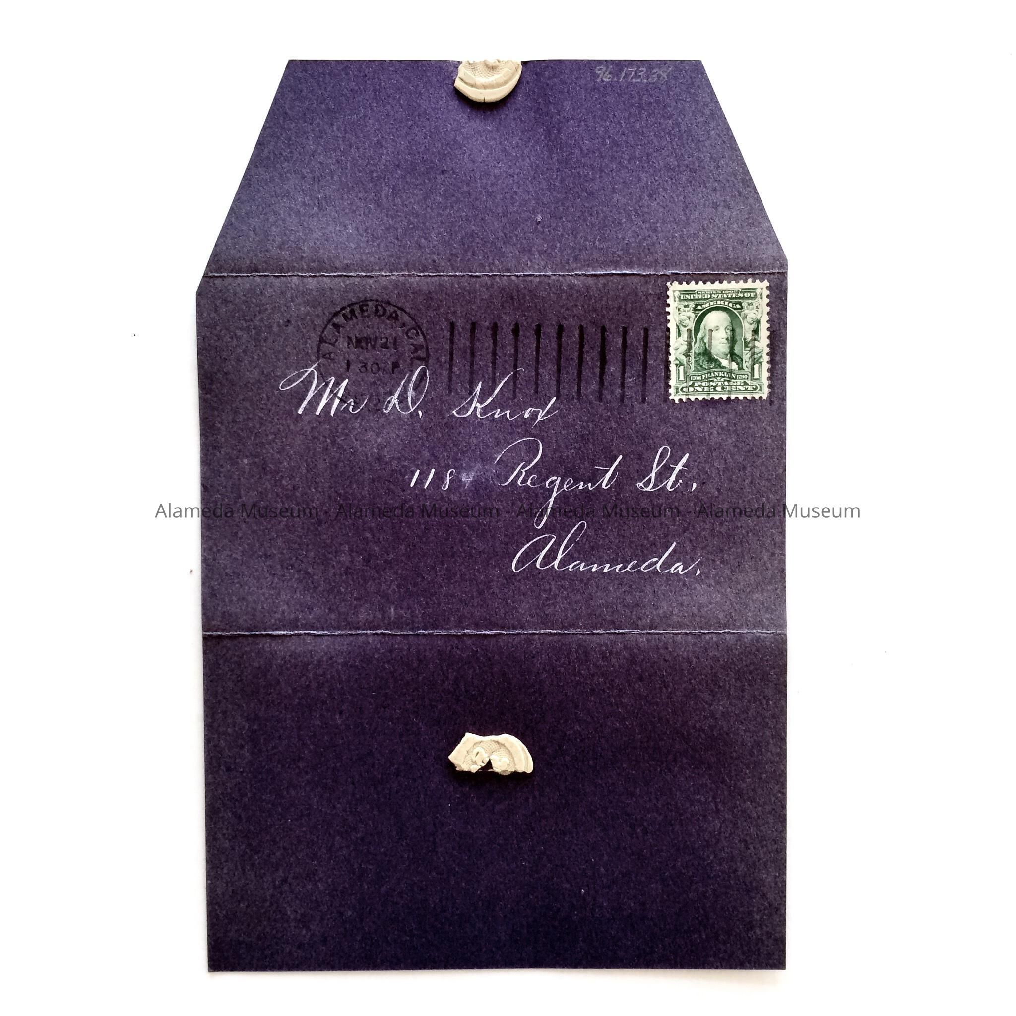 FOLDING INVITATION ON HEAVY PULP PAPER STOCK. INVITATION IN THE FORM OF AN ENVELOPE, WHICH HAS BEEN CIRCULATED AND POSTMARKED.