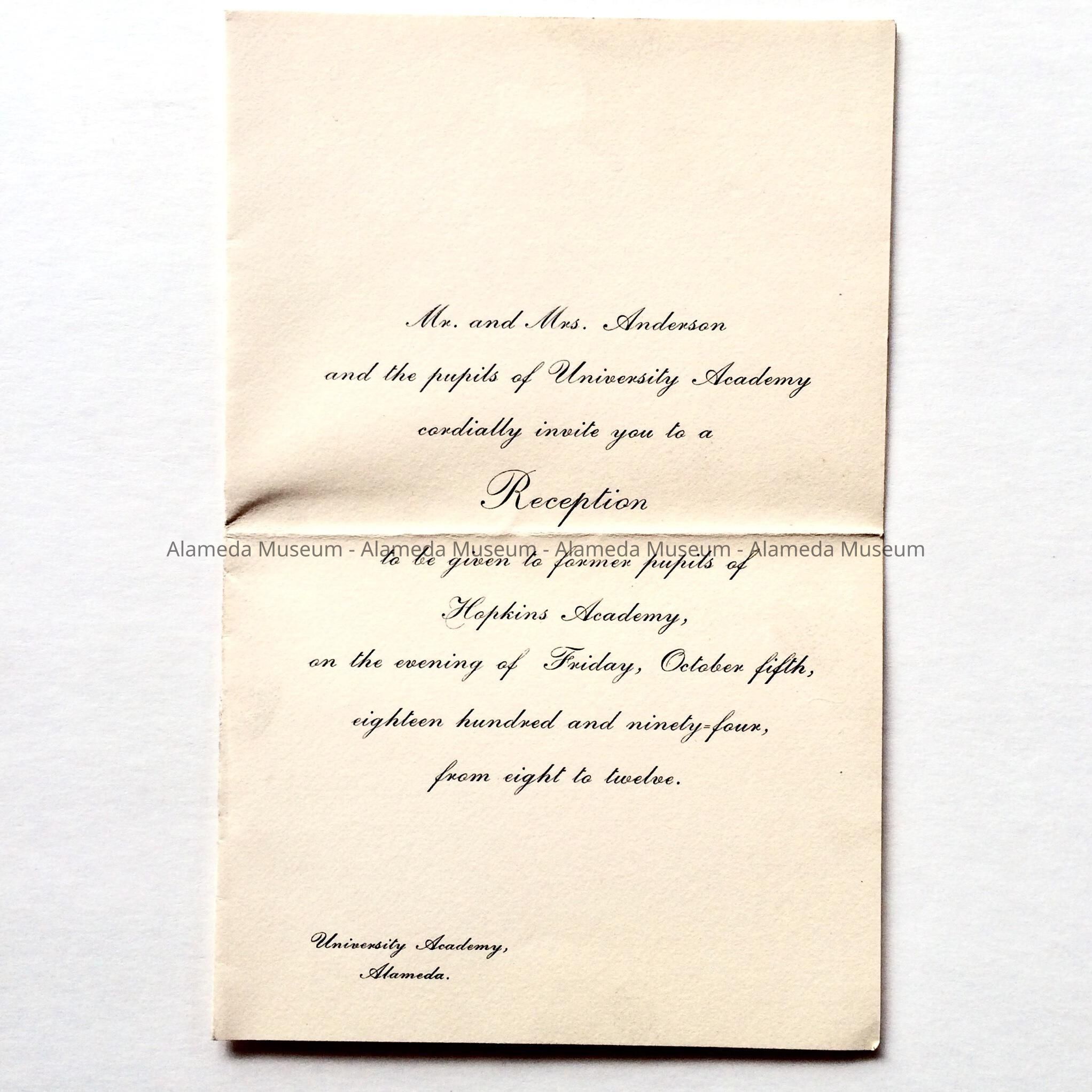 History of Object: Invitation to a reception to be held at Anderson's Academy (or University Academy), Oct. 5th., 1894. The school (junior college) was located at Linden Street & Lincoln Avenue, and was attended by the noted writer Jack London.