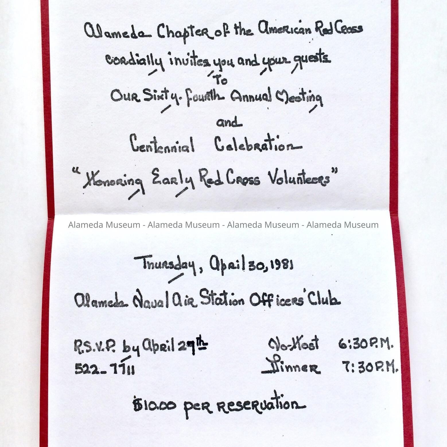 History of Object: Invitation from the Alameda branch of the American Red Cross invited an individual to a chapter meeting on April 30, 1981.